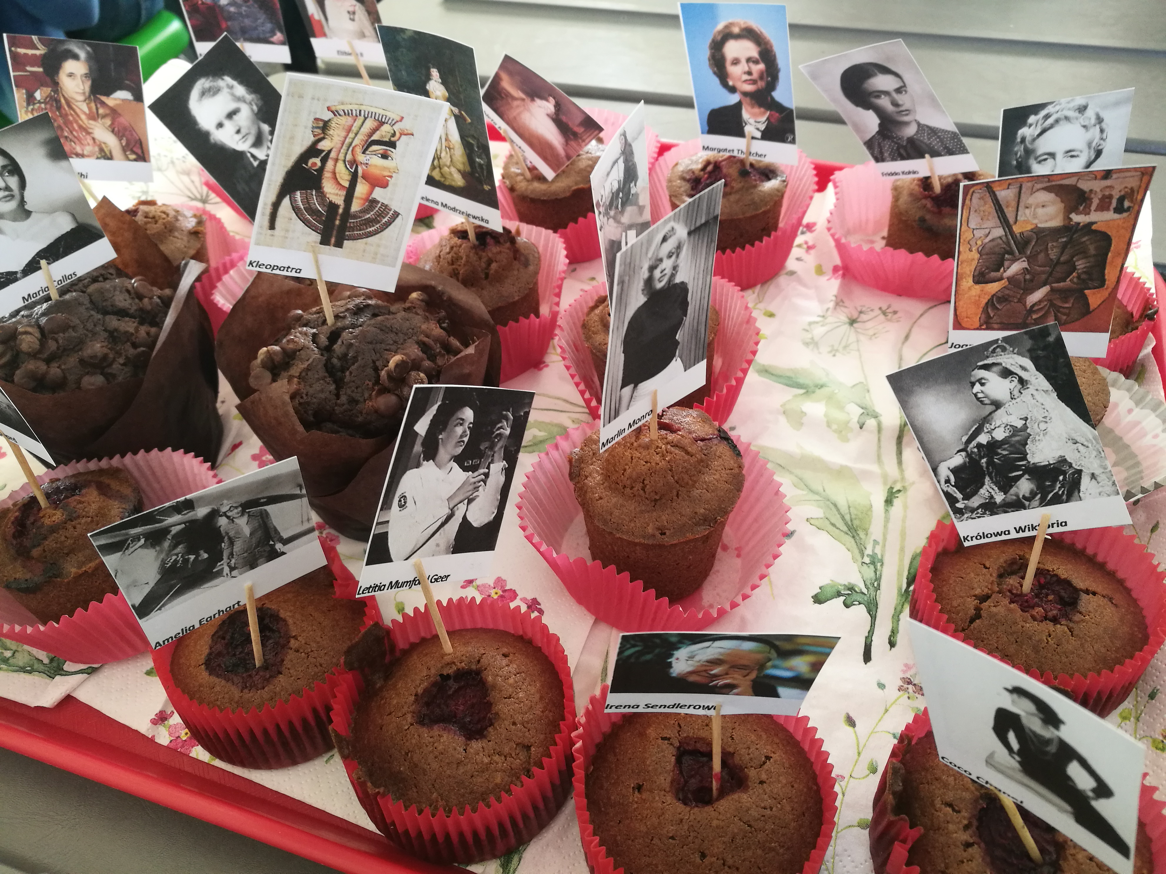 Grupa projektowa uczniów klasy 2 gimnazjum, w składzie Zosia Mrugała, Weronika Sienkiewicz i Filip Wilk realizująca pod opieką p. Agaty Polańskiej projekt pt. „Kobieto, puchu marny? O roli kobiet w historii i kulturze”, zorganizowała w marcu szkolny konkurs „(Ty)Dzień Kobiet”, w którym udział wzięli uczniowie klas 4-7. Przez cały tydzień przedstawiciele klas losowali kolejne zadanie, na wykonanie którego mieli tylko jeden dzień. Musieli m.in. wyszukać w szkolnej bibliotece jak największą liczbę książek napisanych przez kobiety, odnaleźć w różnych źródłach informacje o kobietach - wynalazcach i odkrywcach, rozpoznać i ułożyć z puzzli słynne kobiece portrety oraz przygotować skomponowany z własnych ciał wyraz „kobieta” w dowolnym języku świata. W zaciętej rywalizacji zwyciężyli uczniowie klasy 7a, którzy w nagrodę otrzymali pamiątkową statuetkę oraz upieczone przez organizatorów konkursu babeczki przyozdobione wizerunkami słynnych kobiet. Wszystkim uczestnikom gratulujemy wiedzy i pomysłowości!