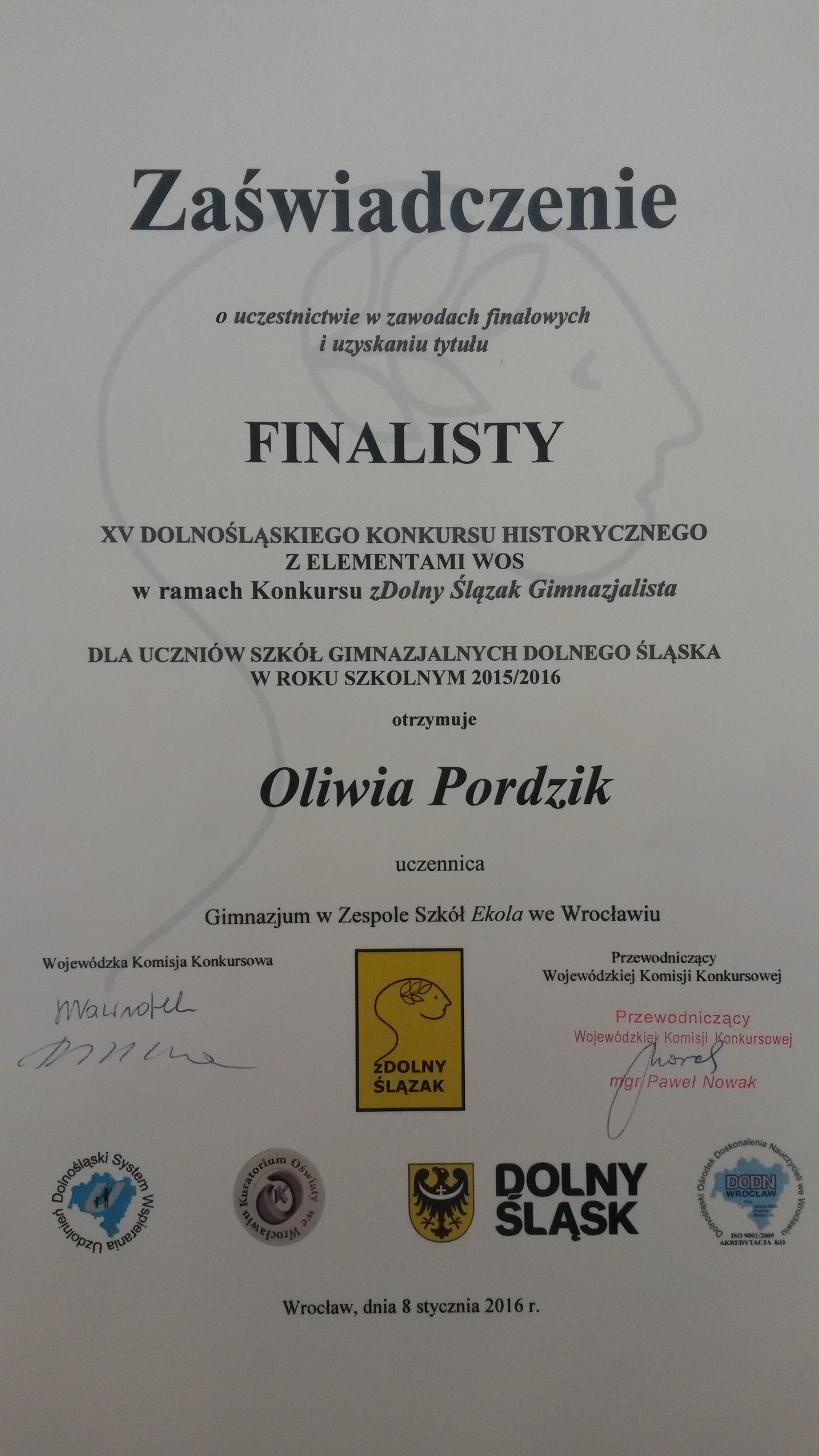 Sukces Oliwii Pordzik z kl. 3a - Oliwia została laureatką XV Dolnośląskiego Konkursu Historycznego z elementami WOS w ramach Konkursu zDolny Ślązak Gimnazjalista: