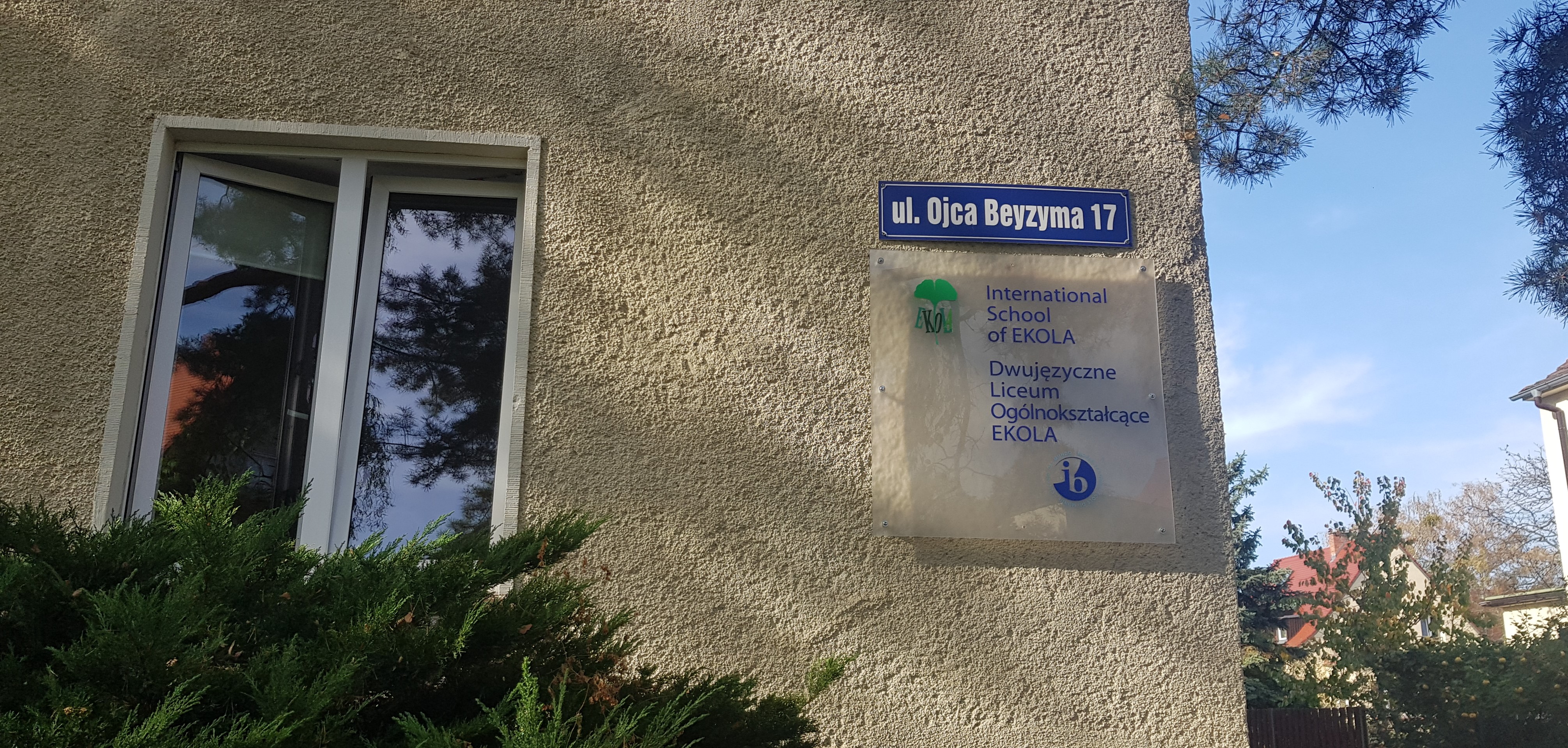 Budynek szkoły znajduje się w spokojnej, zielonej okolicy przy ul. Ojca Beyzyma 17. Posiadamy bardzo dobrze wyposażone sale lekcyjne (tablice interaktywne, komputery, itd), pracownię biologiczno-chemiczną i komputerową oraz bibliotekę. Uczniowie korzystają ponadto z sali gimnastycznej w budynku Szkoły Podstawowej EKOLA przy ul. Tadeusza Zielińskiego 56. W szkole znajdują się wygodne miejsca przeznaczone do odpoczynku w czasie przerw, pokój cichej pracy oraz stołówka wraz z kuchnią do dyspozycji uczniów. Nauczyciele i uczniowie mają dostęp do bezprzewodowego internetu na terenie całej szkoły. Każdy uczeń posiada szafkę w szatni szkolnej. Reasumując, nasza bezpieczna i kameralna szkoła stwarza wspaniałe warunki do pracy i wypoczynku.