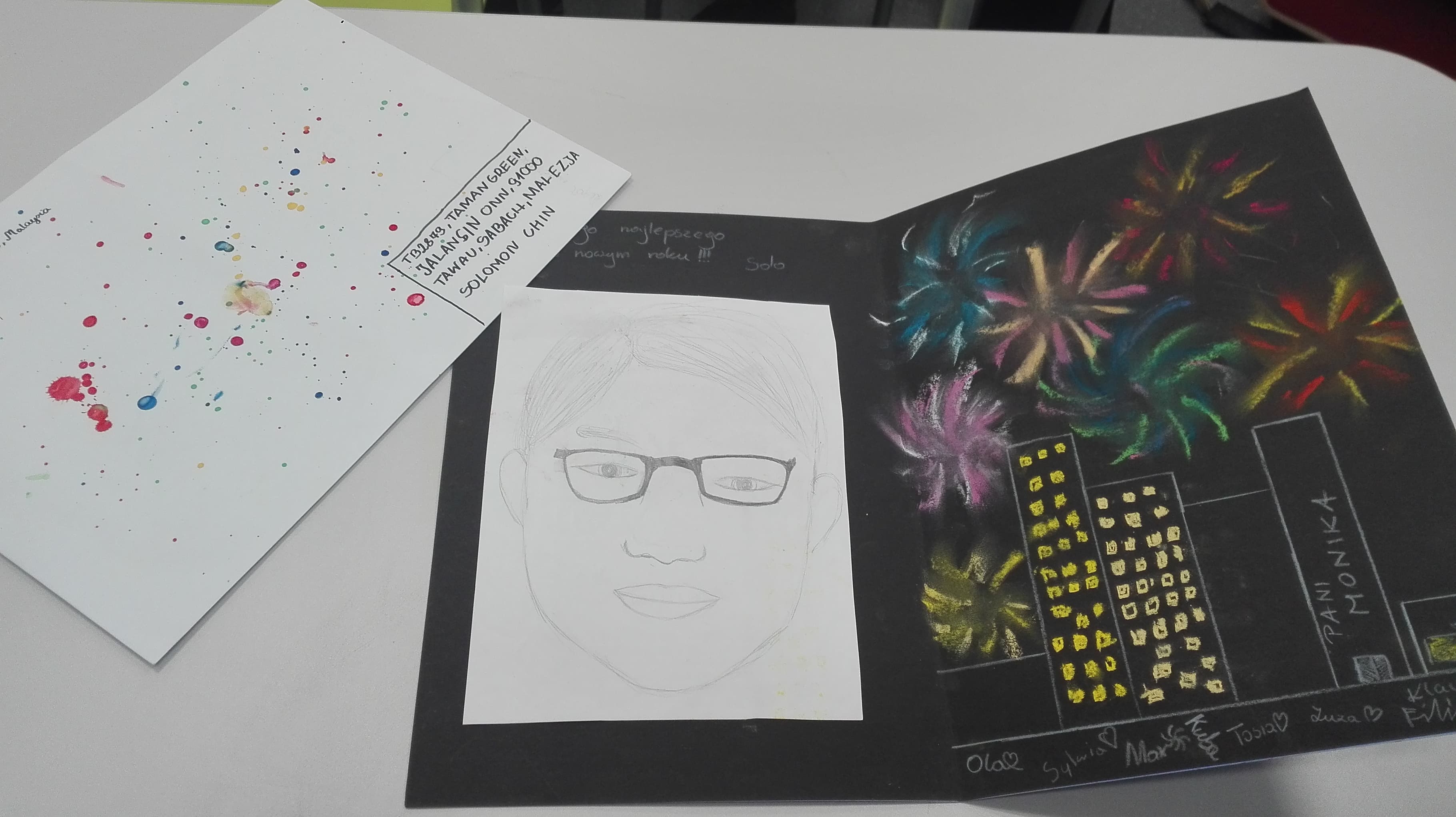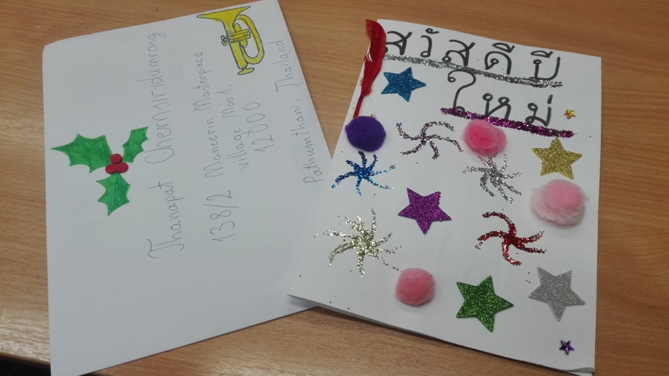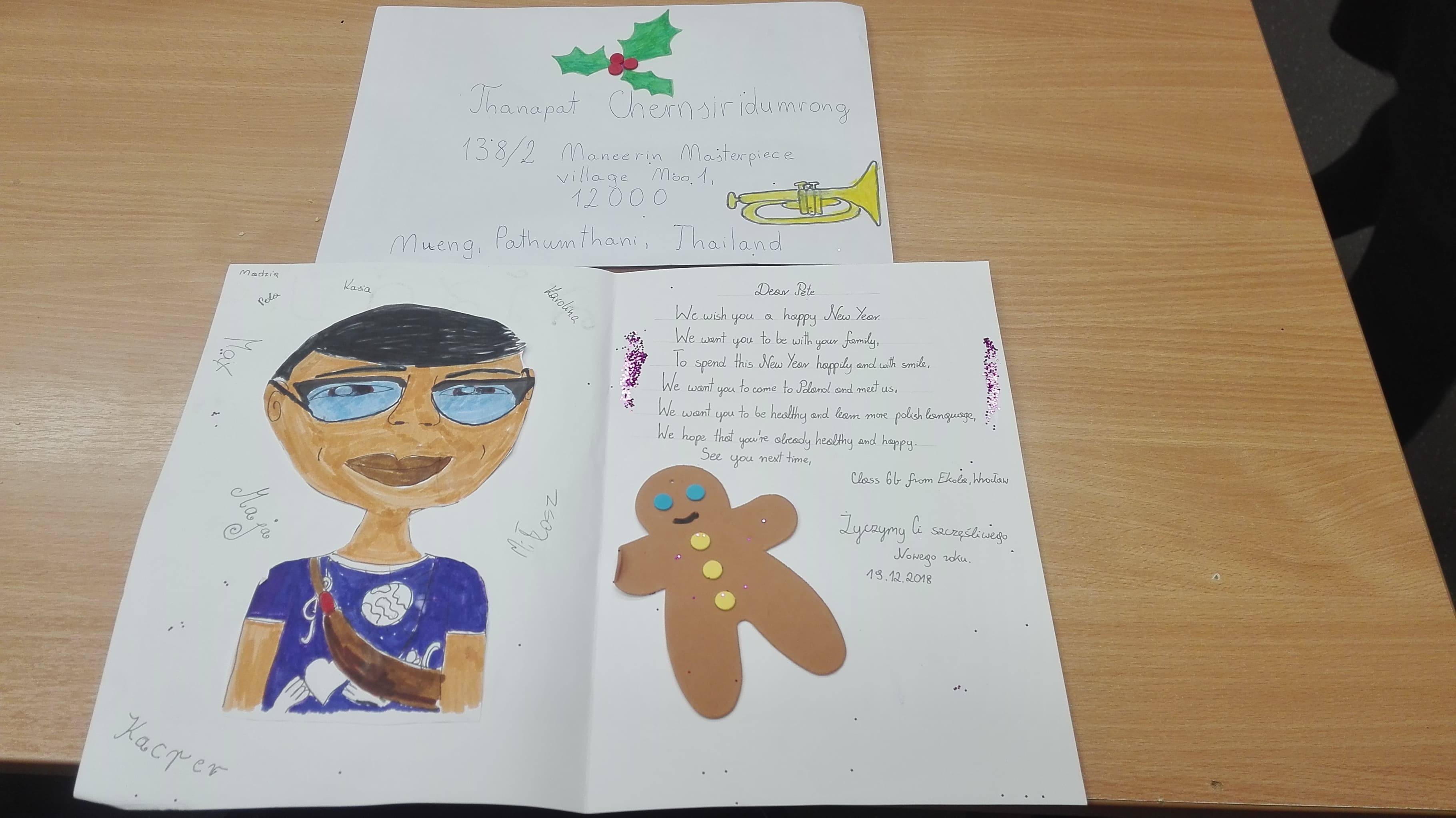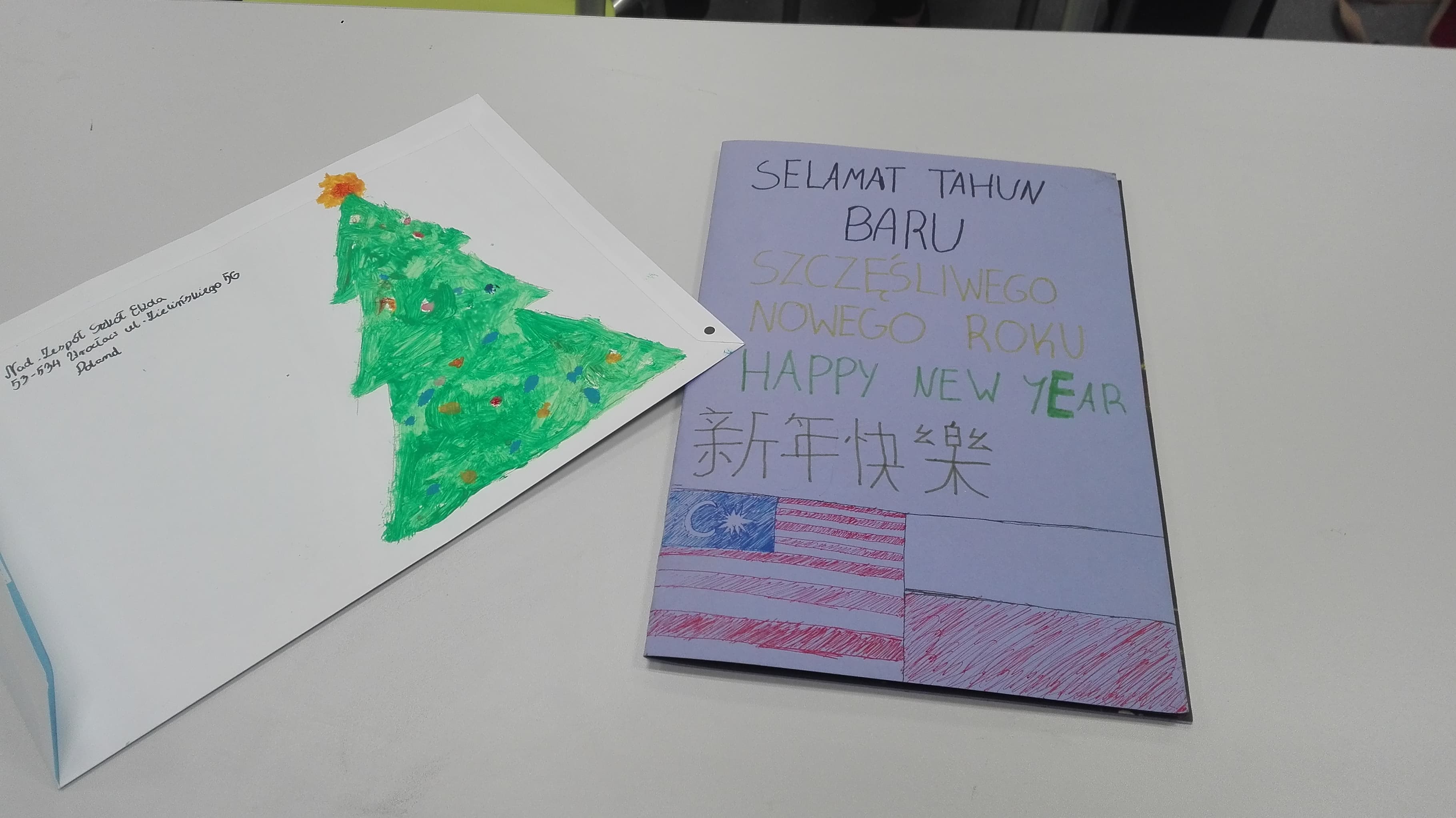 Uczniowie klas 6a i 6b wprowadzili w życie ciekawy pomysł wysłania pocztówek świąteczno-noworocznych do uczniów z Tajlandii i Malezji, z którymi wcześniej prowadzili rozmowy przez internet. Szóstoklasiści napisali życzenia w różnych językach (również po tajsku i malajsku), narysowali portrety oraz wykonali dekoracje. Oj, będzie NIESPODZIANKA!