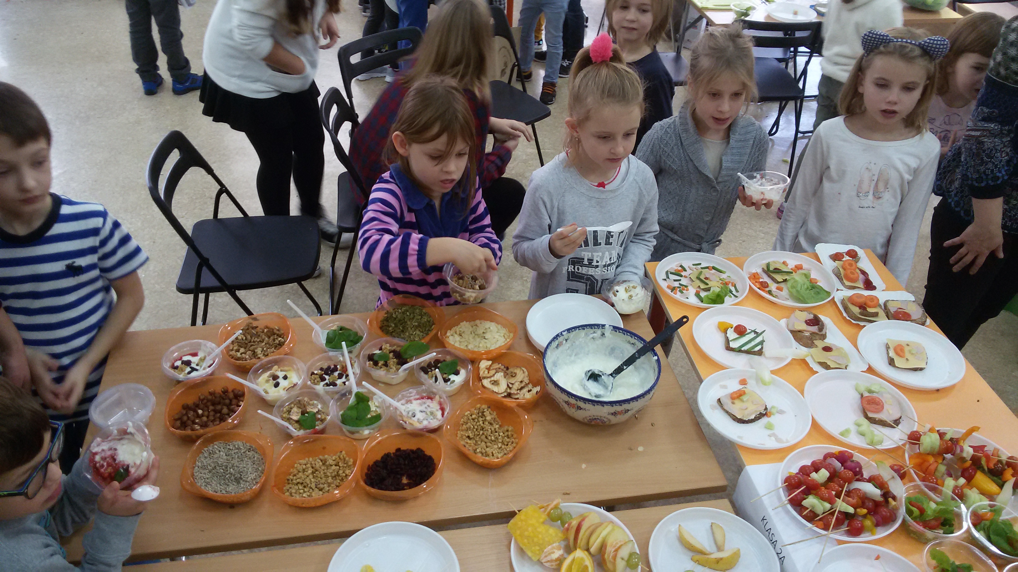 Po raz kolejny w auli EKOLI spotkali się 8 listopada najmłodsi uczniowie z klas 1-3, aby przygotować niecodzienne śniadanie: warzywne, owocowe, kanapkowe i deserowe. Dzieci przyniosły odpowiednie produkty i kuchenne akcesoria, kroiły, mieszały, układały wspaniałe kompozycje – obrazy do zjedzenia. Najmłodszym pomagali ich koledzy z klasy 6b i gimnazjaliści z klasy drugiej. Ich pomoc, a także rodziców i wychowawców, bardzo się przydała. Dziękujemy!