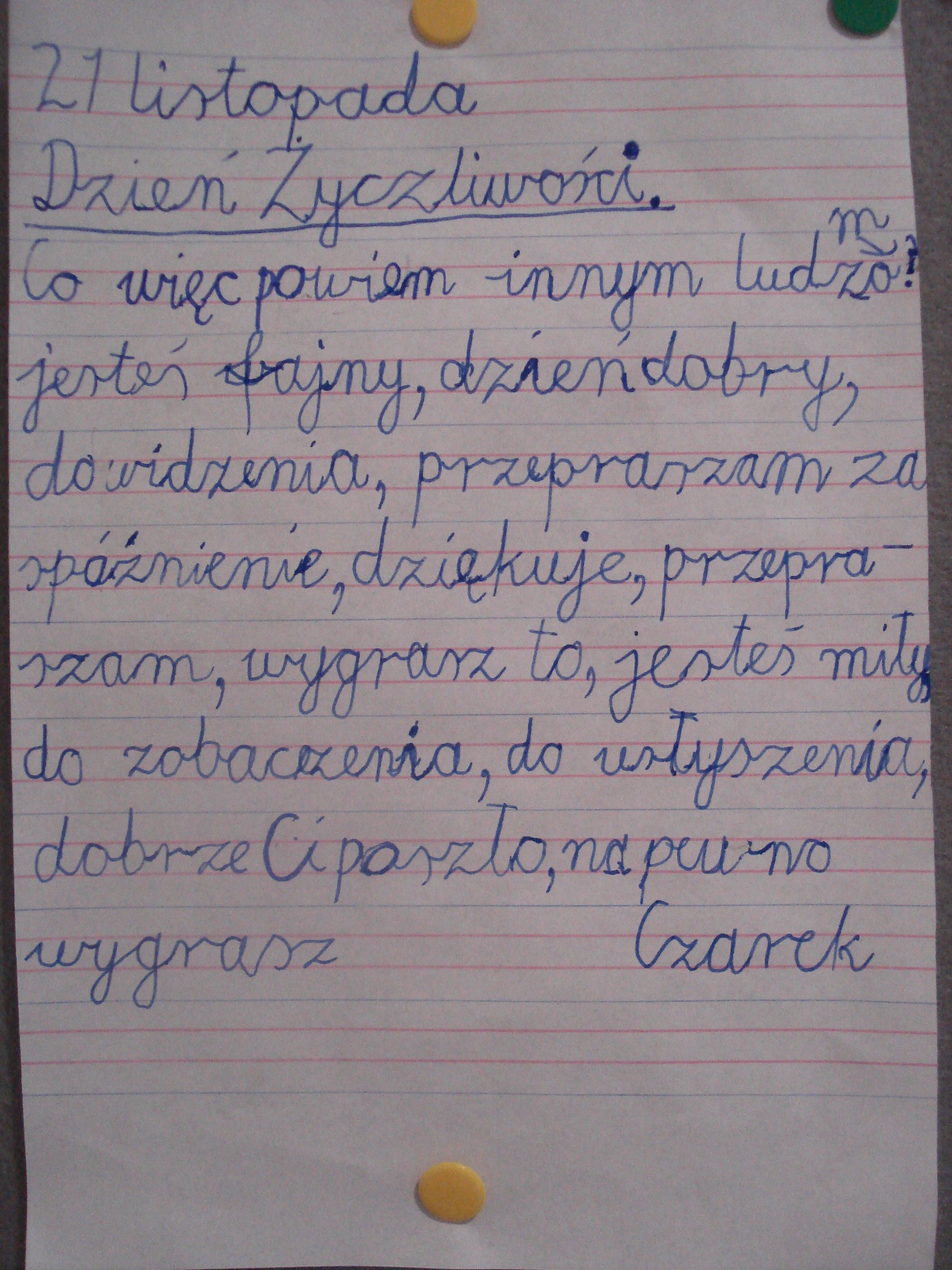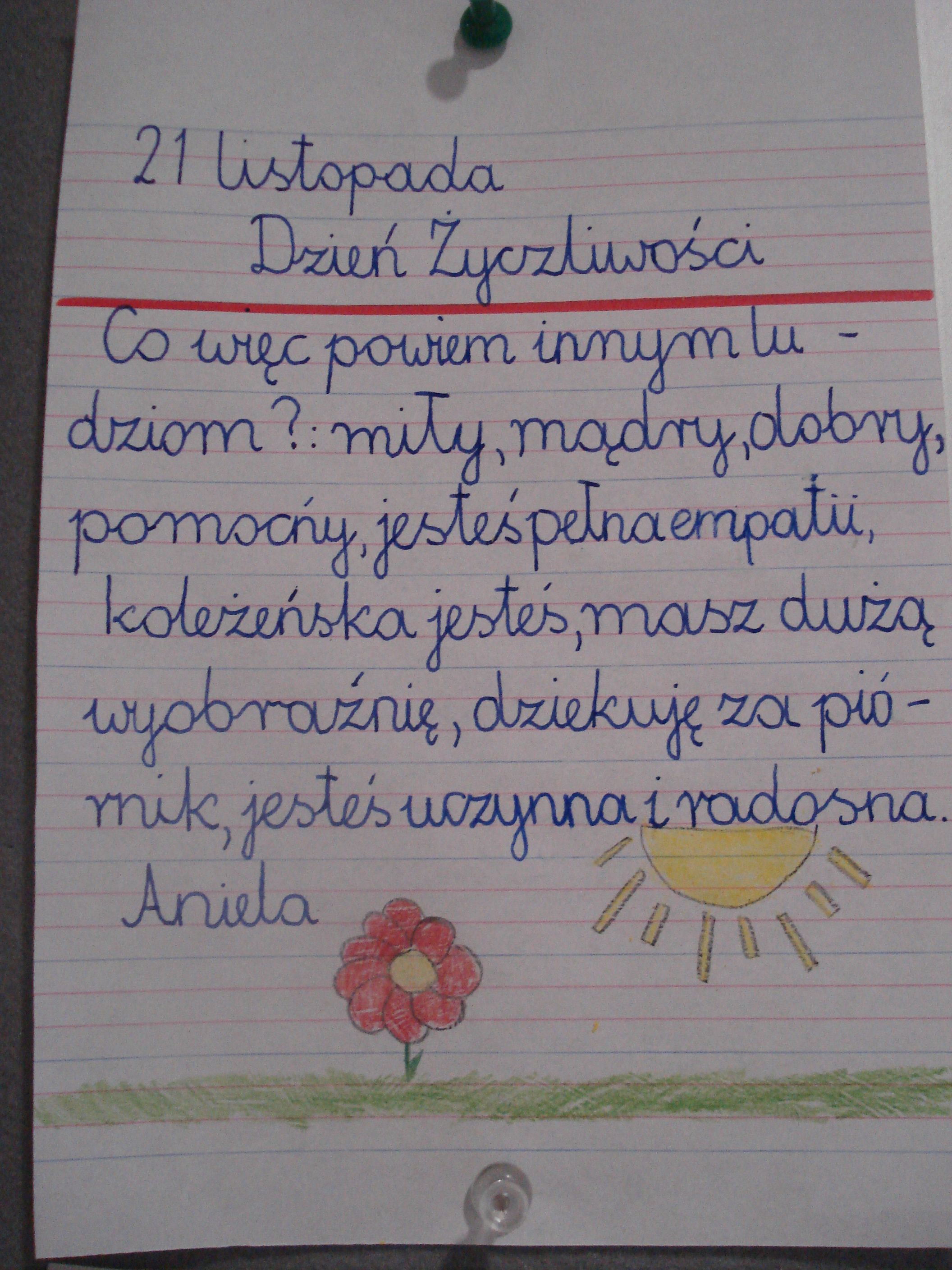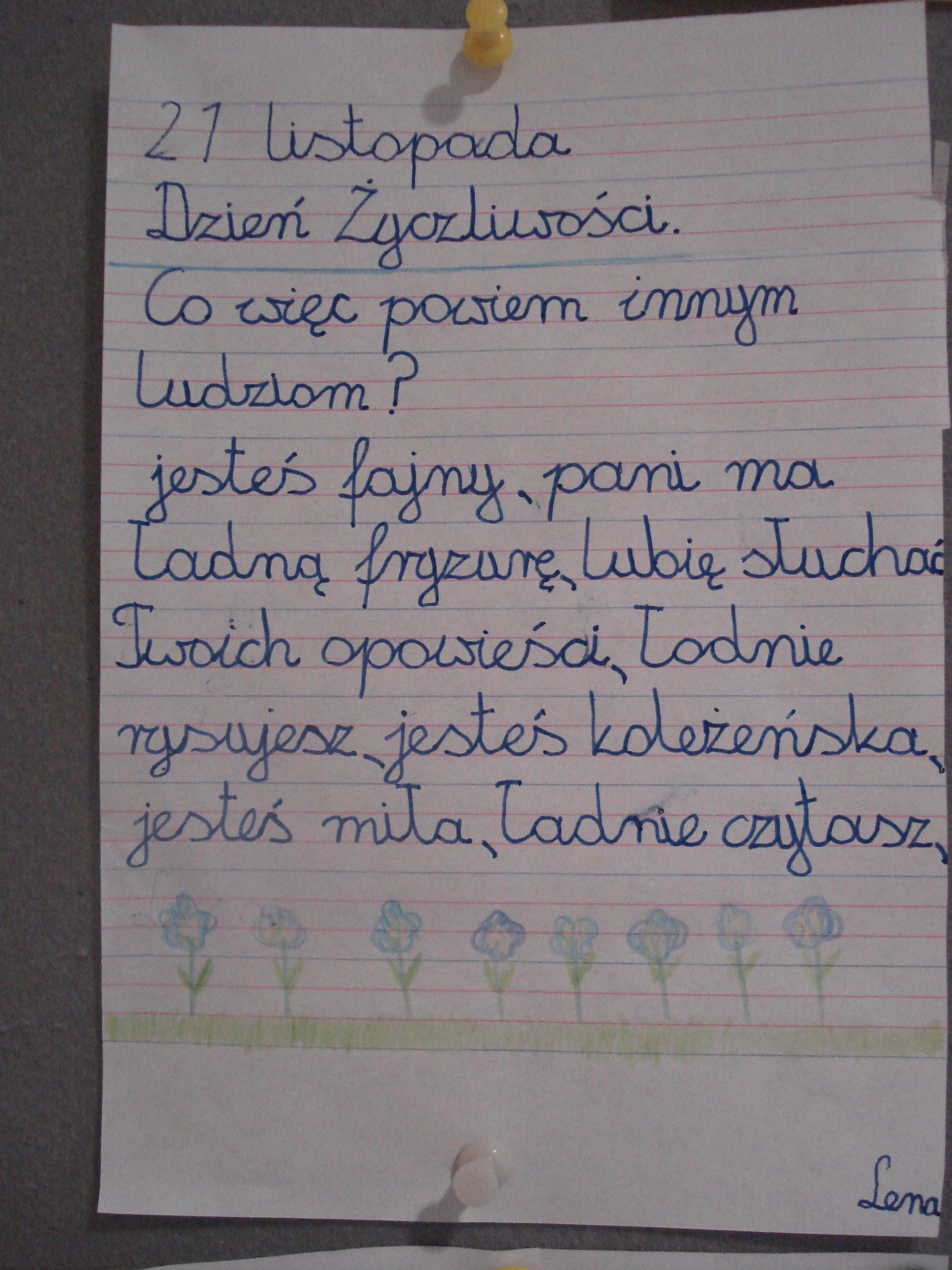 Klasa 2b wraz z wychowawczynią Ewą Czuszkiewicz zastanawiała się, JAK i CO mówić innym, aby było im miło. I to nie tylko z okazji Dnia Życzliwości. Poniżej próbki dzieci: