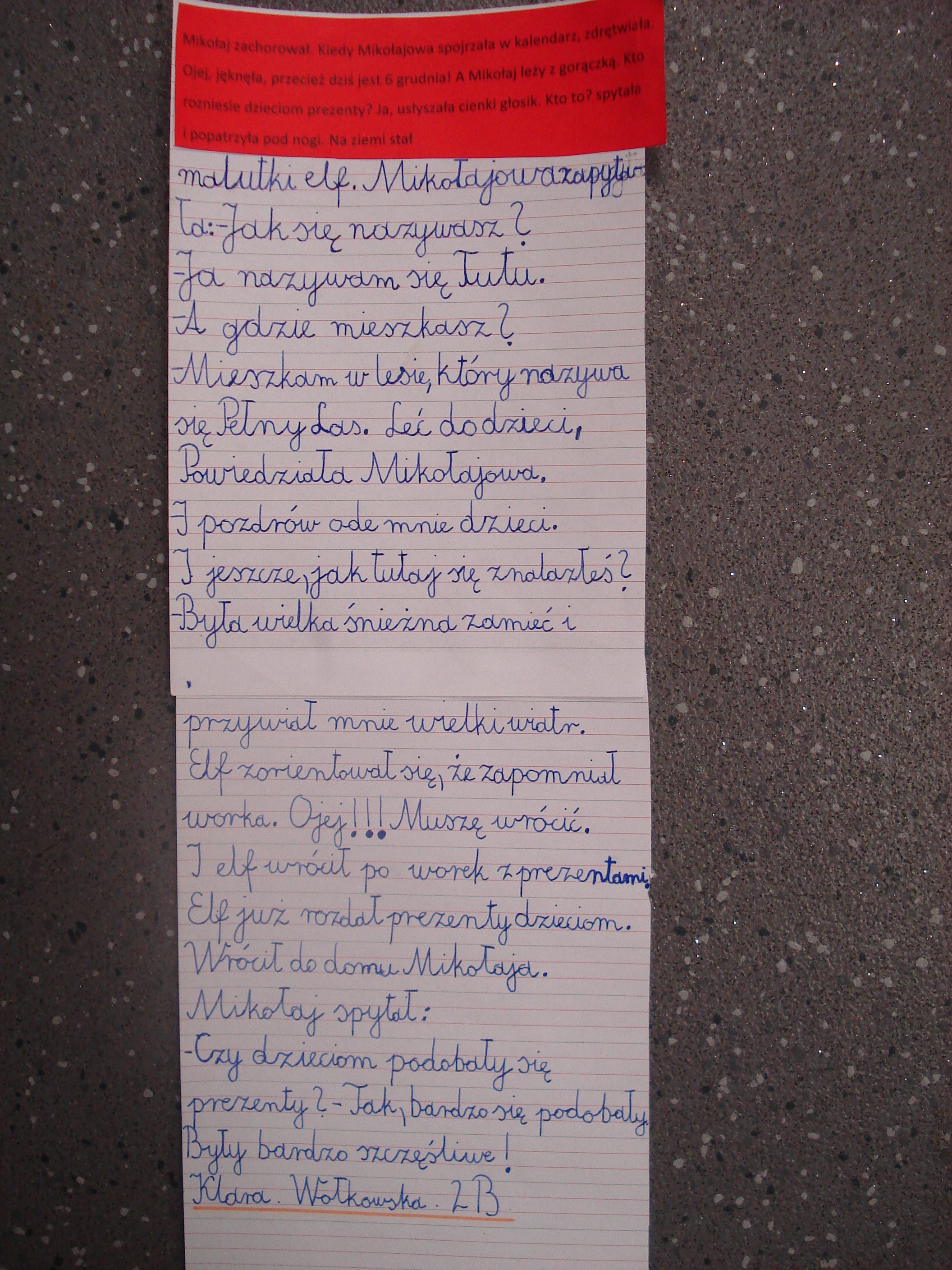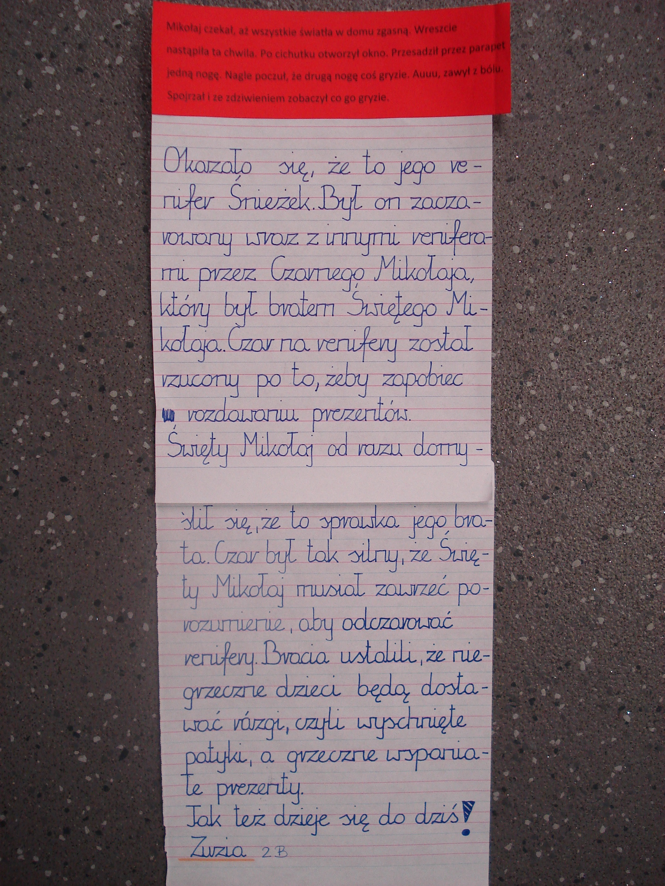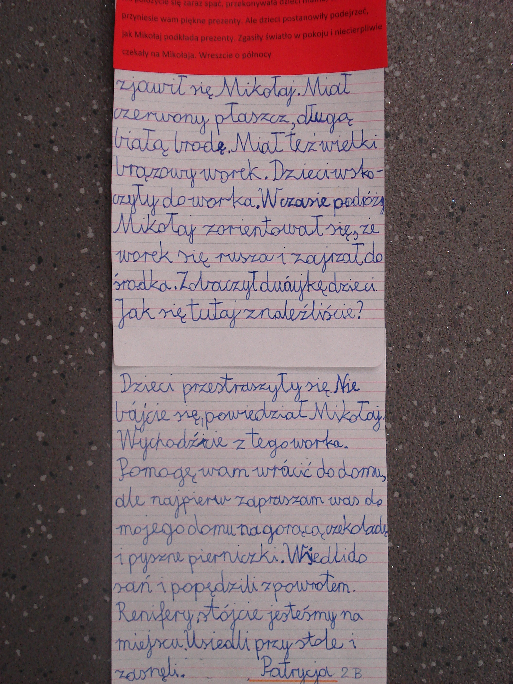 Klasa 2b miała rzadką okazję zamienić się w bajkopisarzy. Każde dziecko dostało mikołajowy tekst, ale niedokończony. Zadaniem było napisanie ciągu dalszego. Dzieciom zadanie bardzo się spodobało. Niektórzy rozpisali się na 4 strony! Poczytajcie... Część prac tutaj, reszta w galerii.