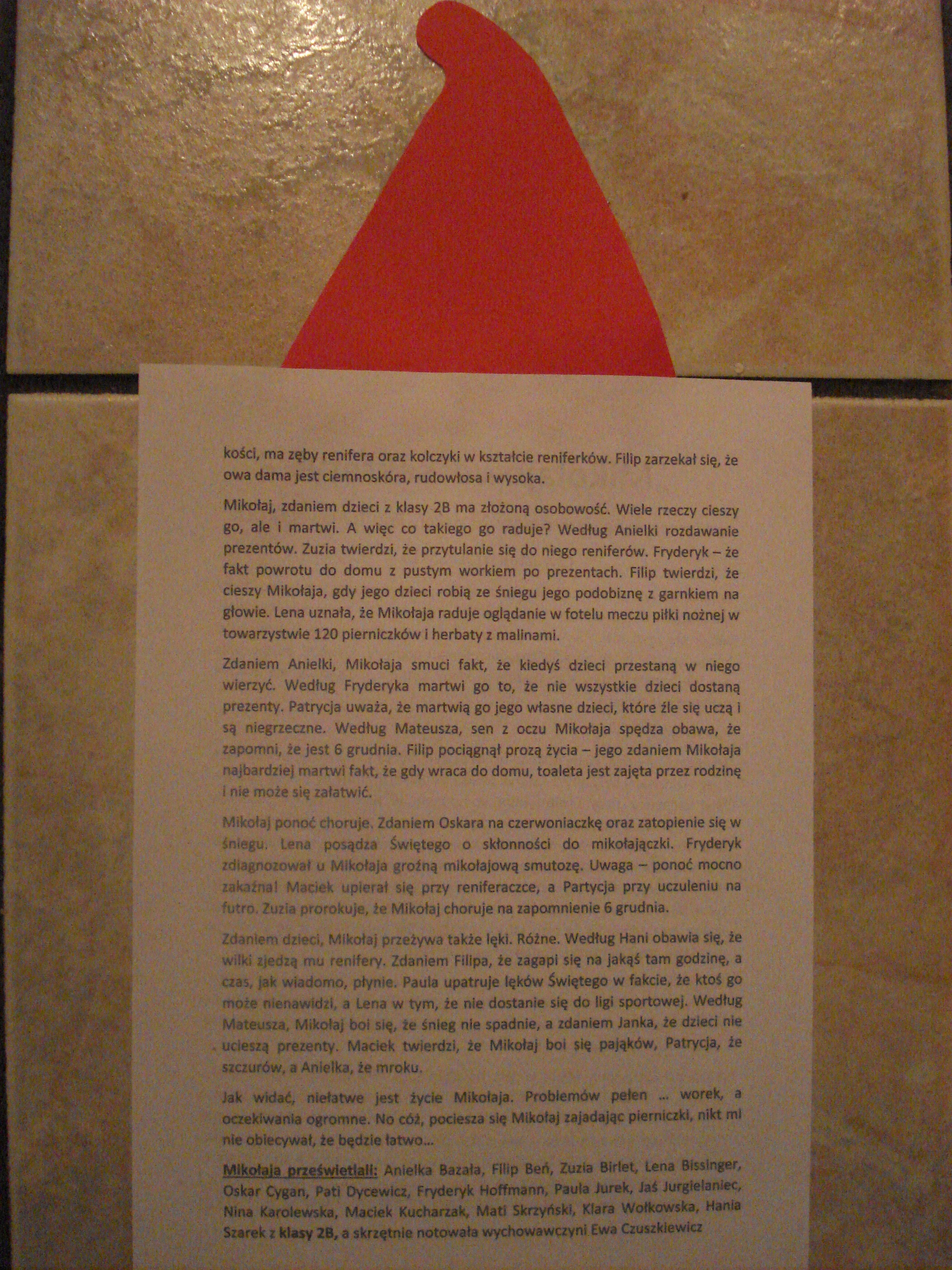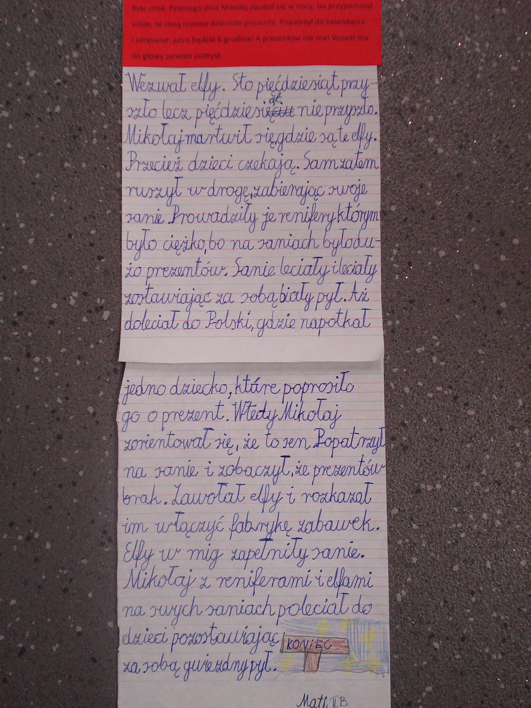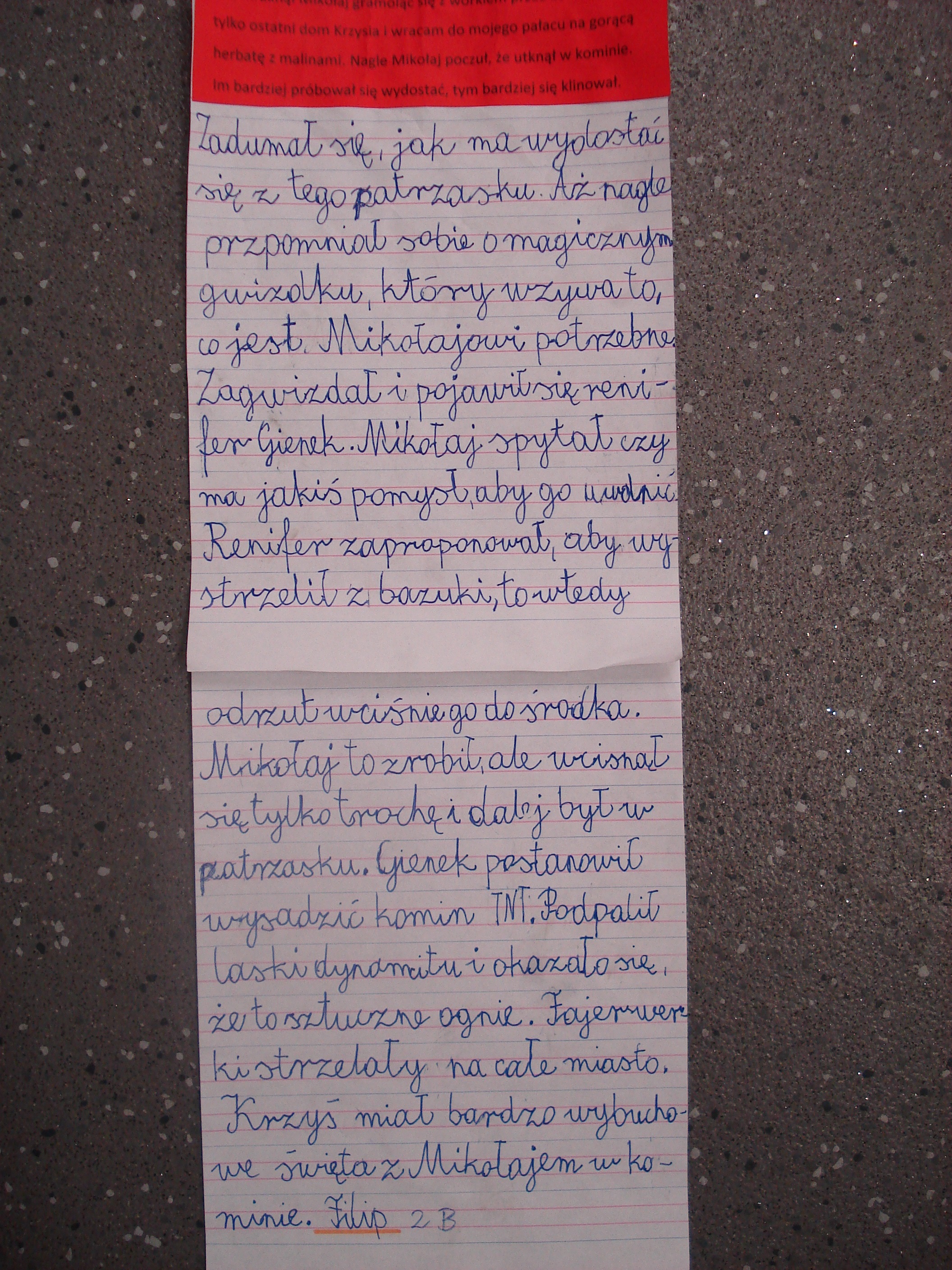 Klasa 2b miała rzadką okazję zamienić się w bajkopisarzy. Każde dziecko dostało mikołajowy tekst, ale niedokończony. Zadaniem było napisanie ciągu dalszego. Dzieciom zadanie bardzo się spodobało. Niektórzy rozpisali się na 4 strony! Poczytajcie... Część prac tutaj, reszta w galerii.