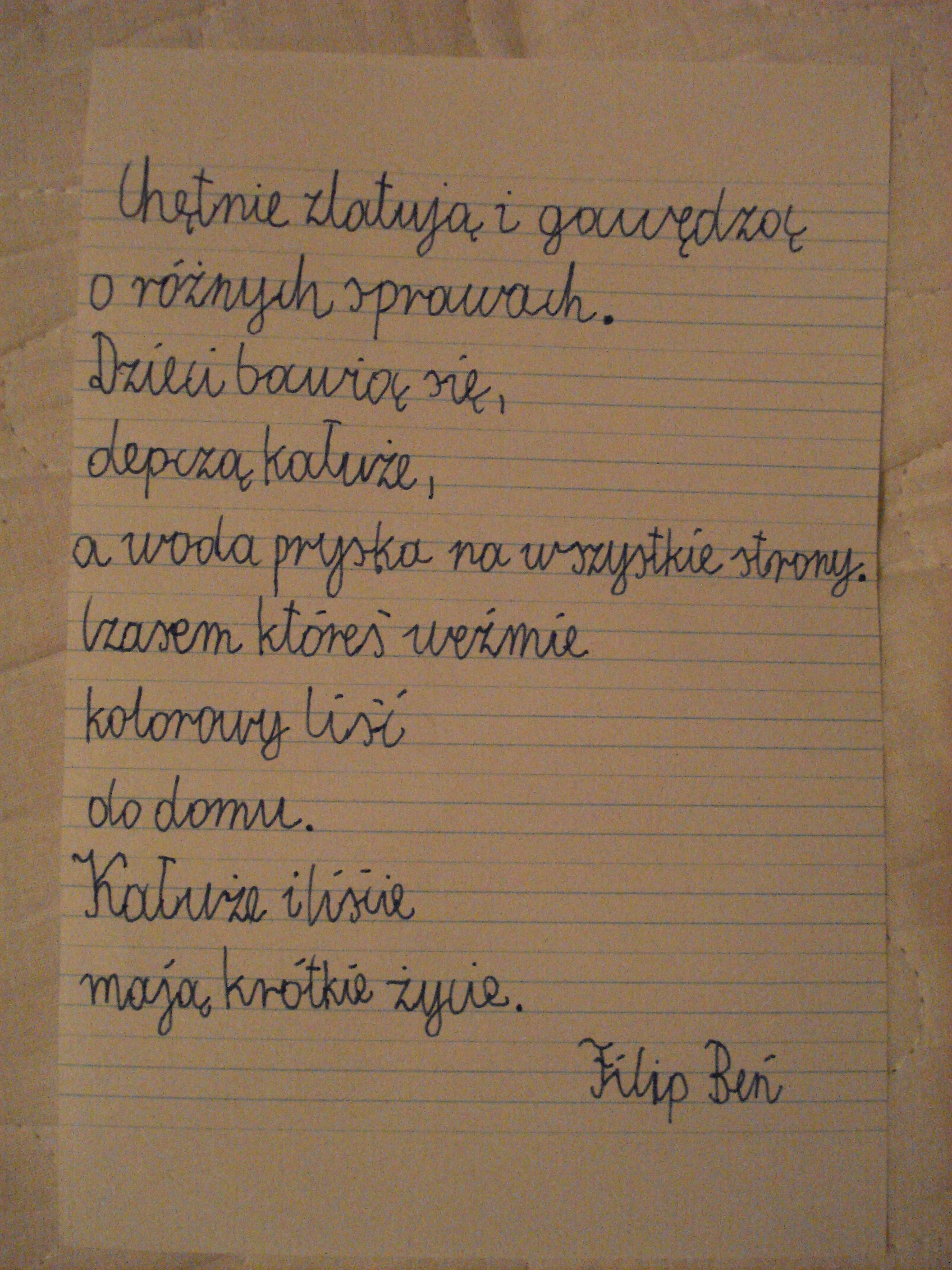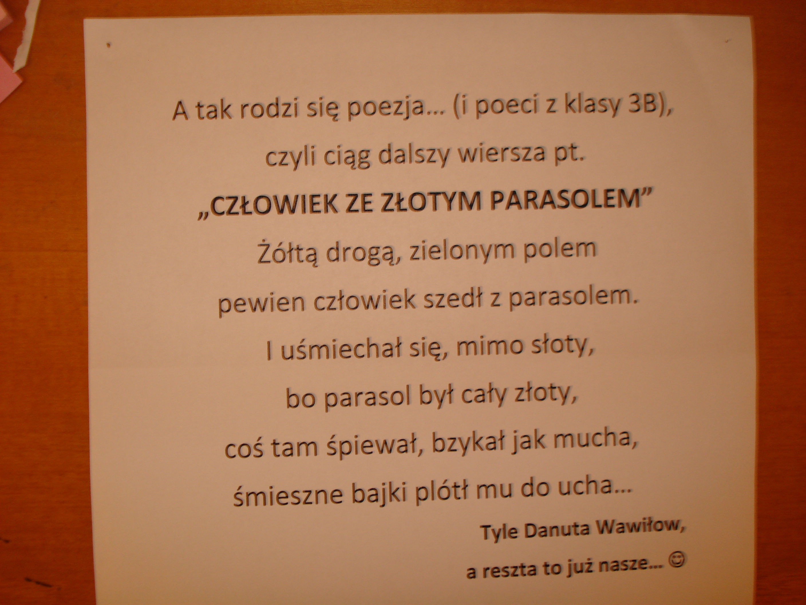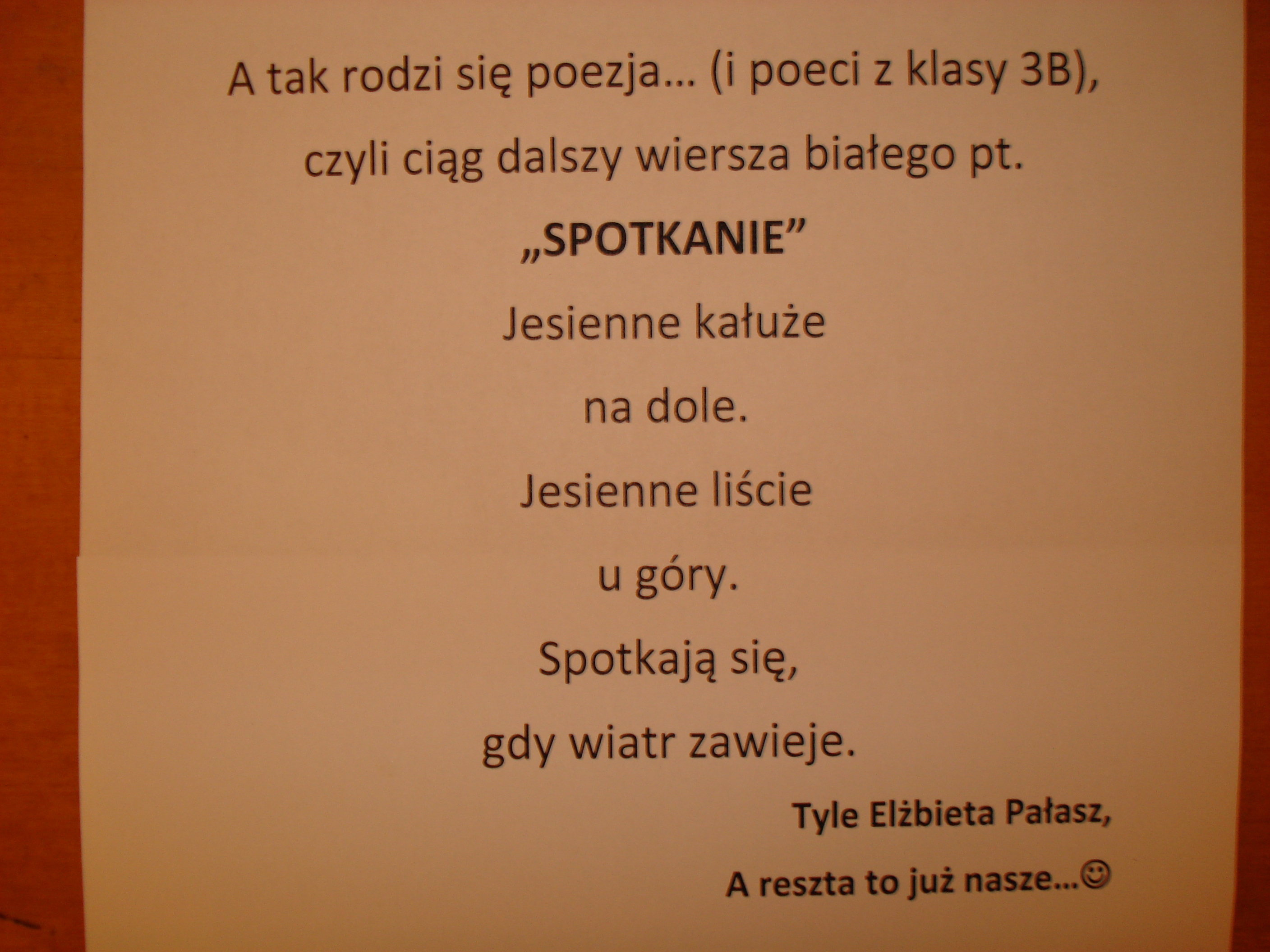 A tak rodzi się poezja: uczniowie klasy 3b natchnieni weną twórczą, zastąpili poetów - Danutę Wawiłow i Elżbietę Pałasz - i napisali ciągi dalsze ich dwóch wierszy. Poczytajcie i oceńcie sami...