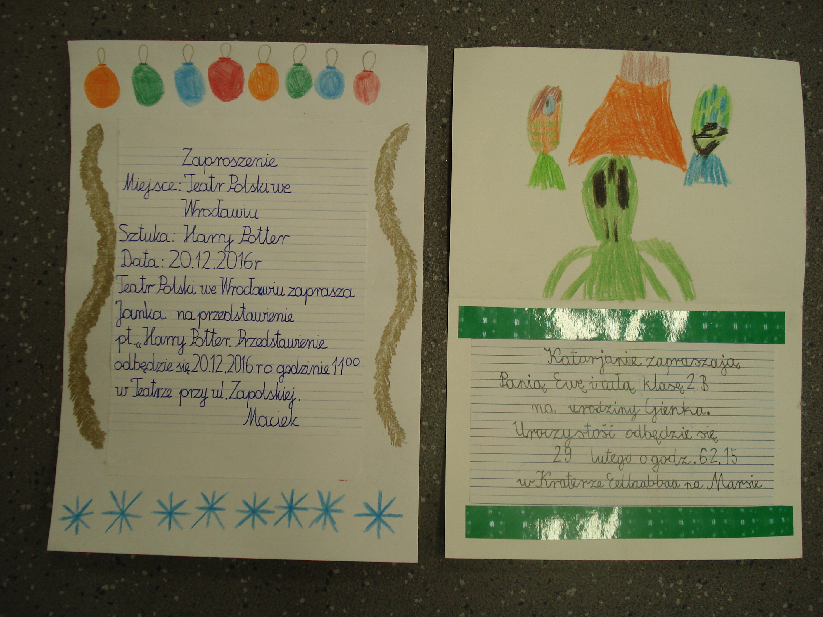 Sztuka zapraszania to wielka umiejętność. Dla klasy 2b to już drobnostka. Cała klasa przygotowała teksty zaproszeń dla różnych osób i na różne imprezy. Popatrzcie: