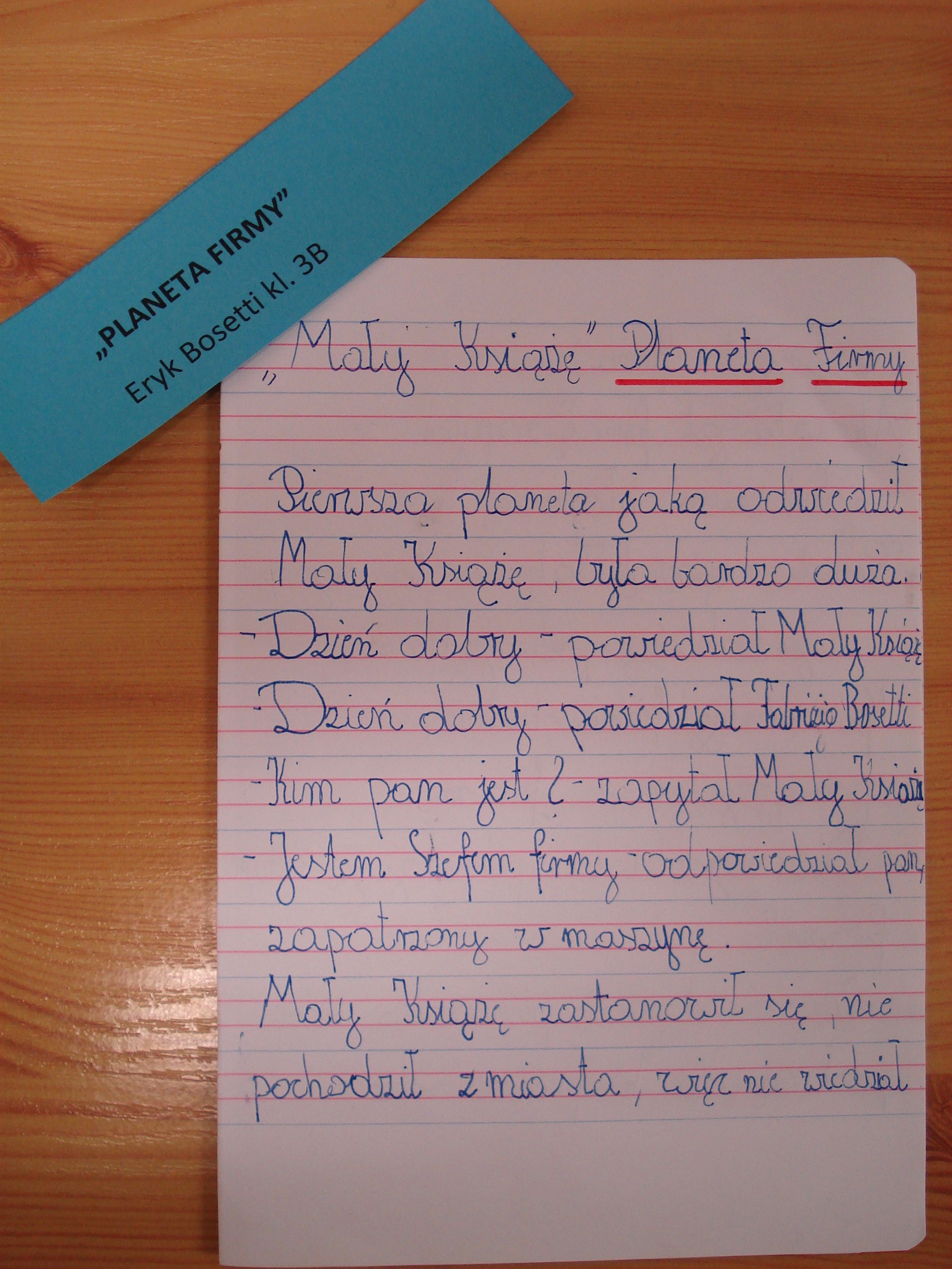 Dzieci z klasy 3b wzbogaciły kultową książkę "Mały Książę" o nowe rozdziały. Wyobraźnia podpowiedziała im, jaką jeszcze planetę odwiedził Mały Książę podczas swojej wędrówki w Kosmosie. Poczytajcie i spójrzcie na portrety Małego Księcia w naszej galerii :)