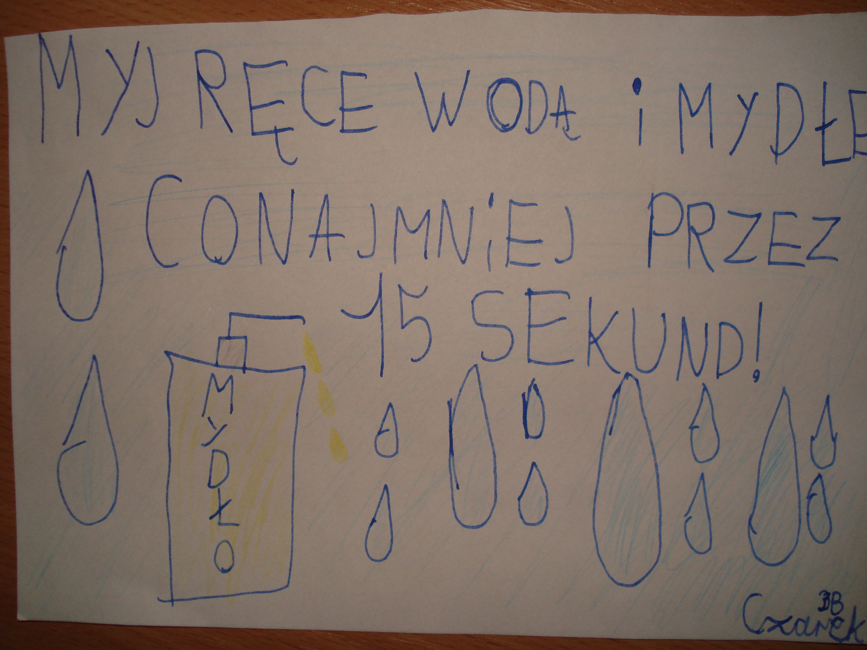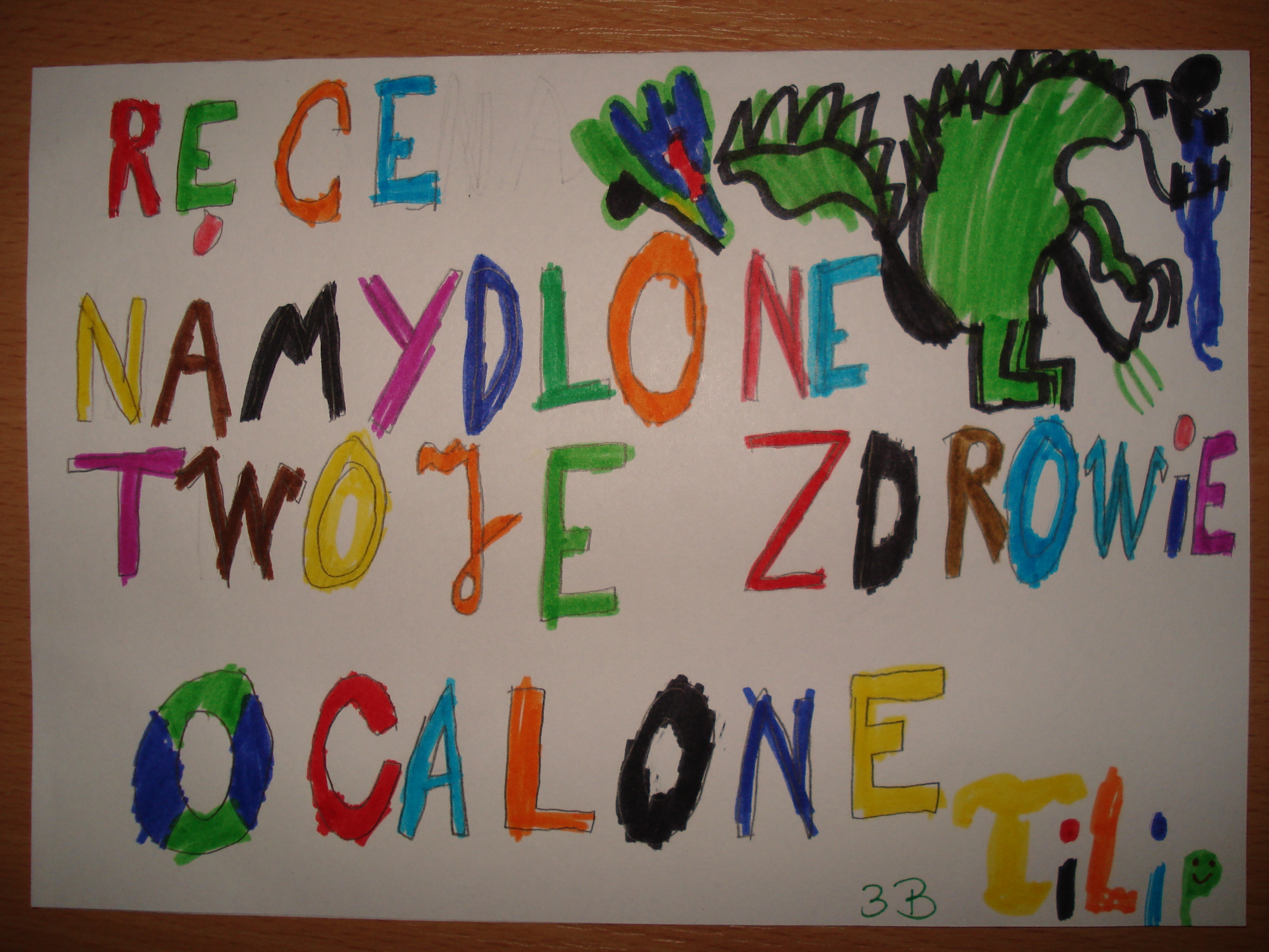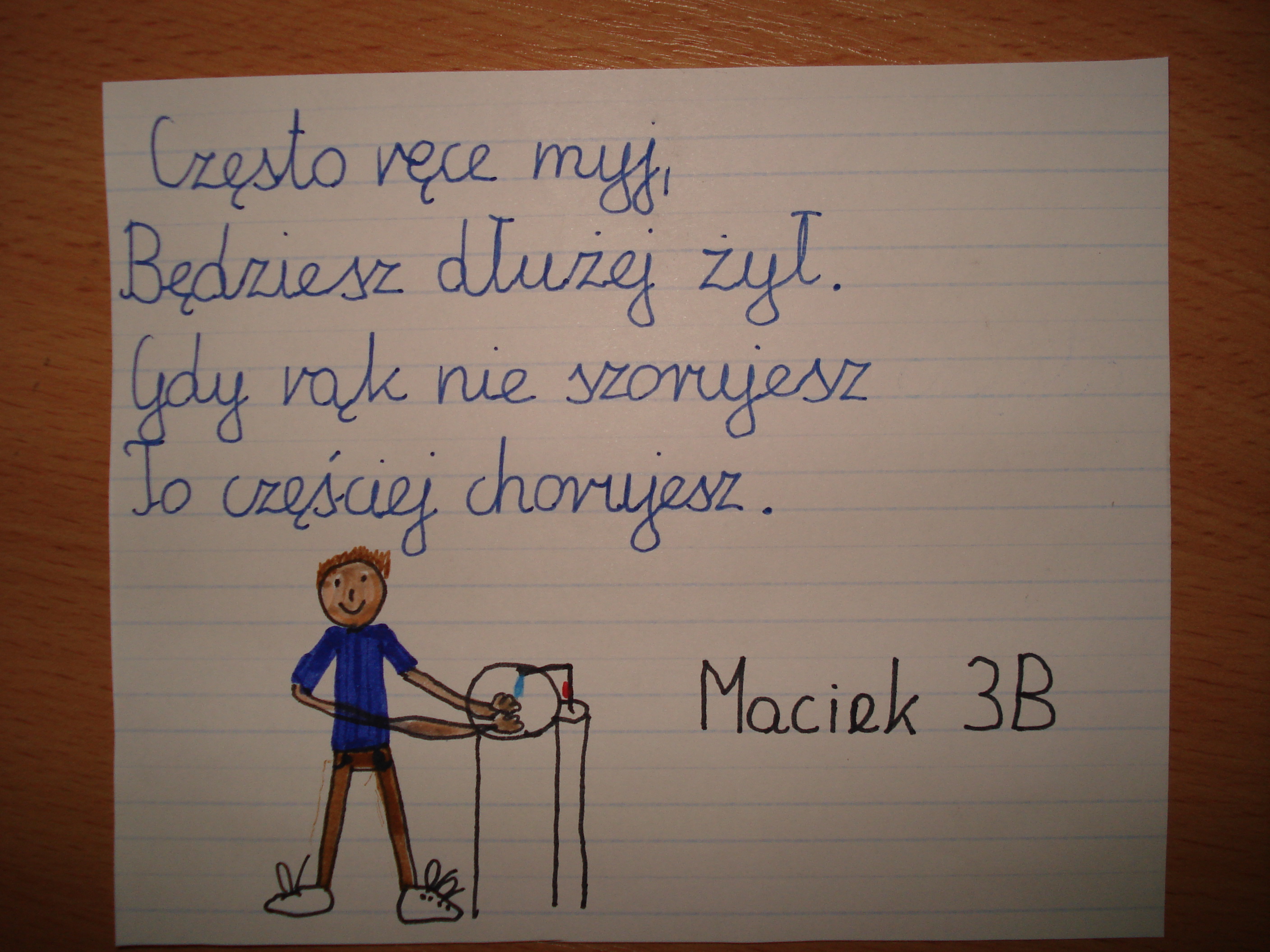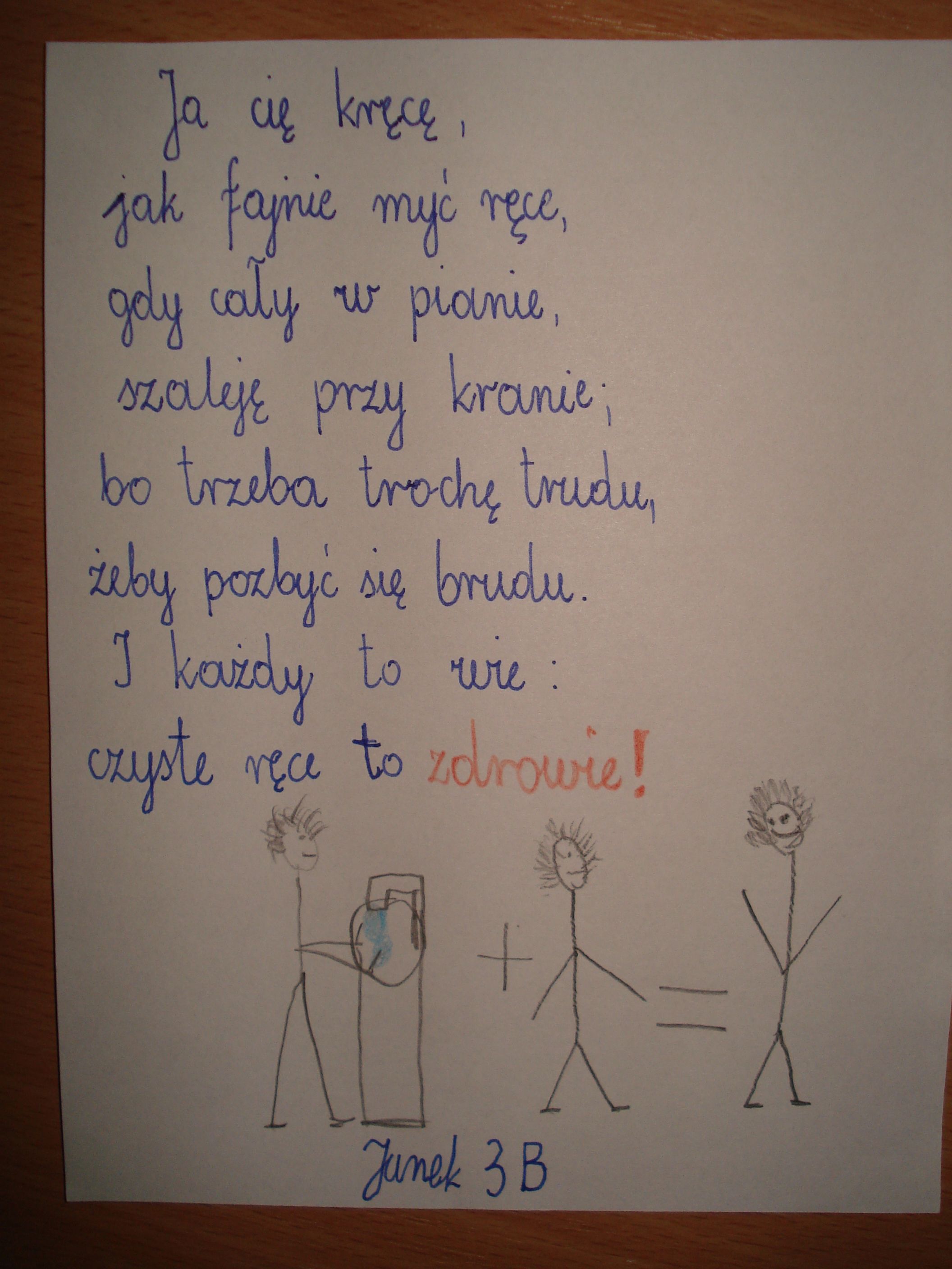 Klasa 3b postanowiła w nieco żartobliwy sposób przypominać młodszym kolegom o konieczności systematycznego mycia rąk po wyjściu z toalety. Każdy napisał hasło-rymowankę i opatrzył ją rysunkiem. Rekordziści napisali po 4 wierszyki. Wszystkie prace zawisły na drzwiach szkolnej toalety. Już są widoczne pierwsze efekty – ilość zużywanego papierowego ręcznika uległa podwojeniu.
