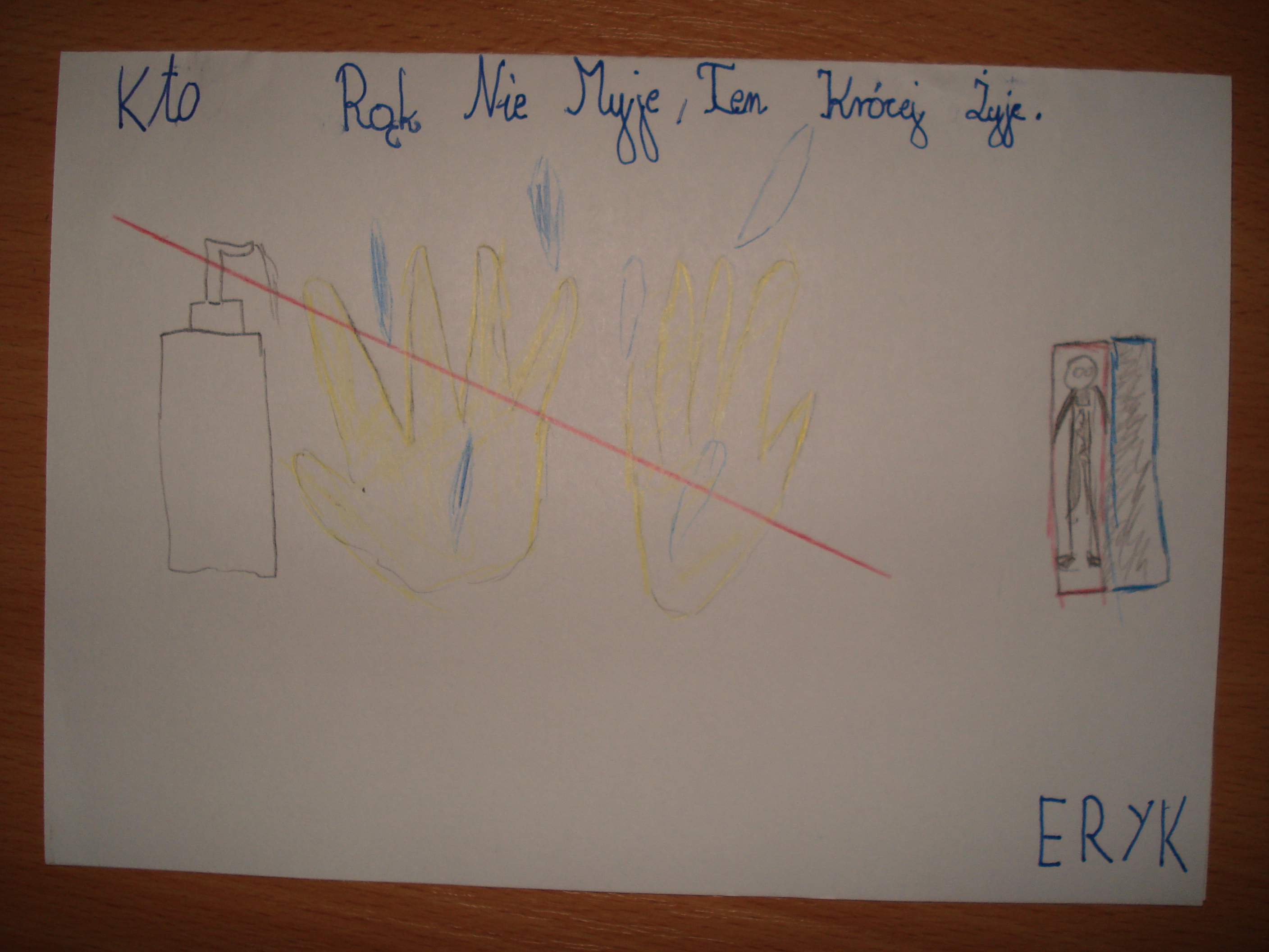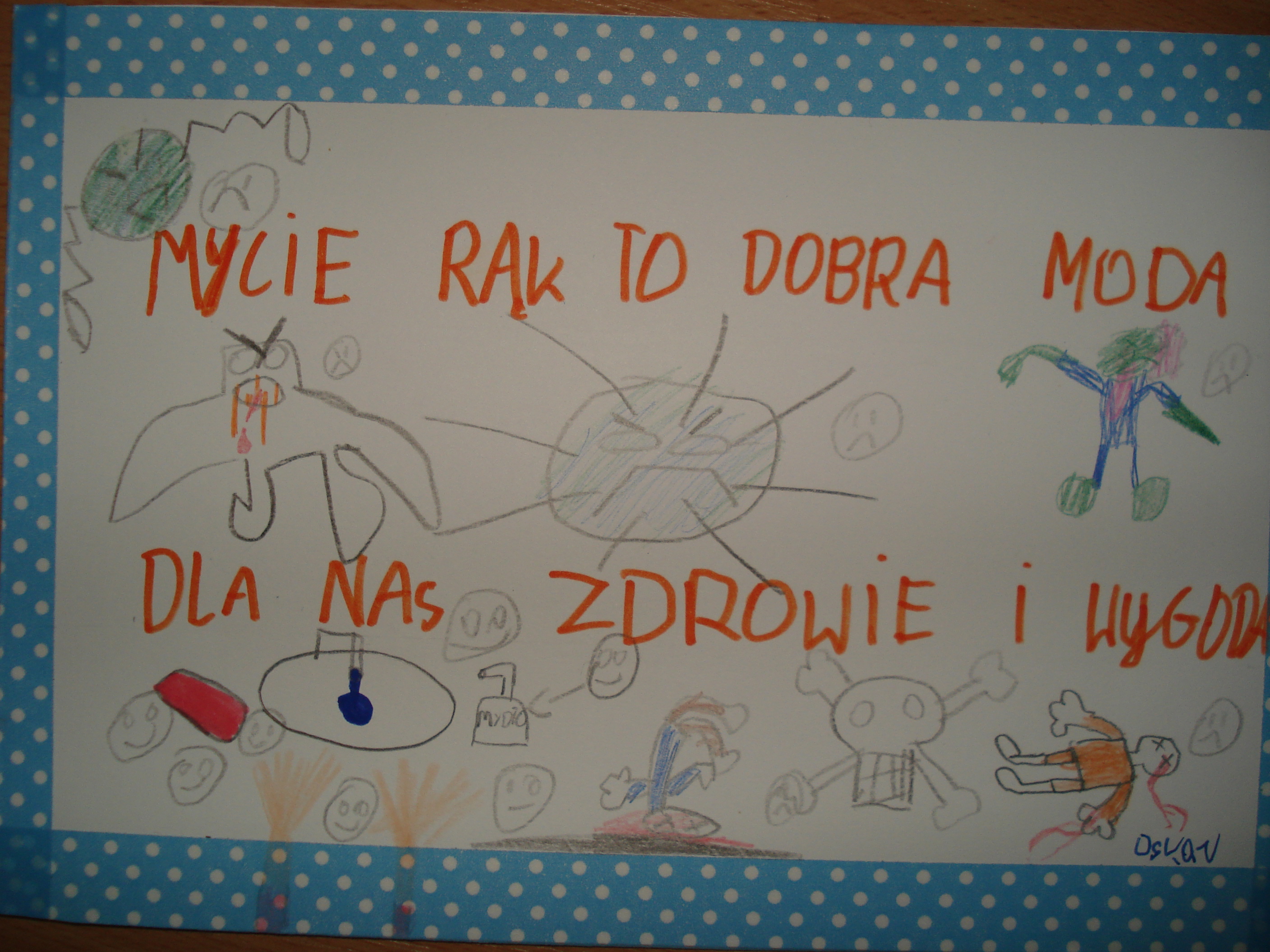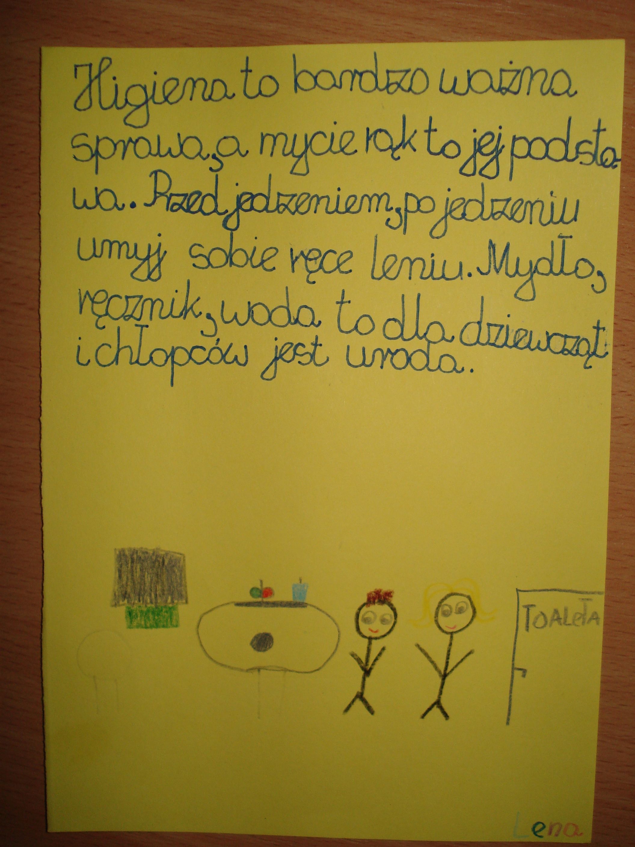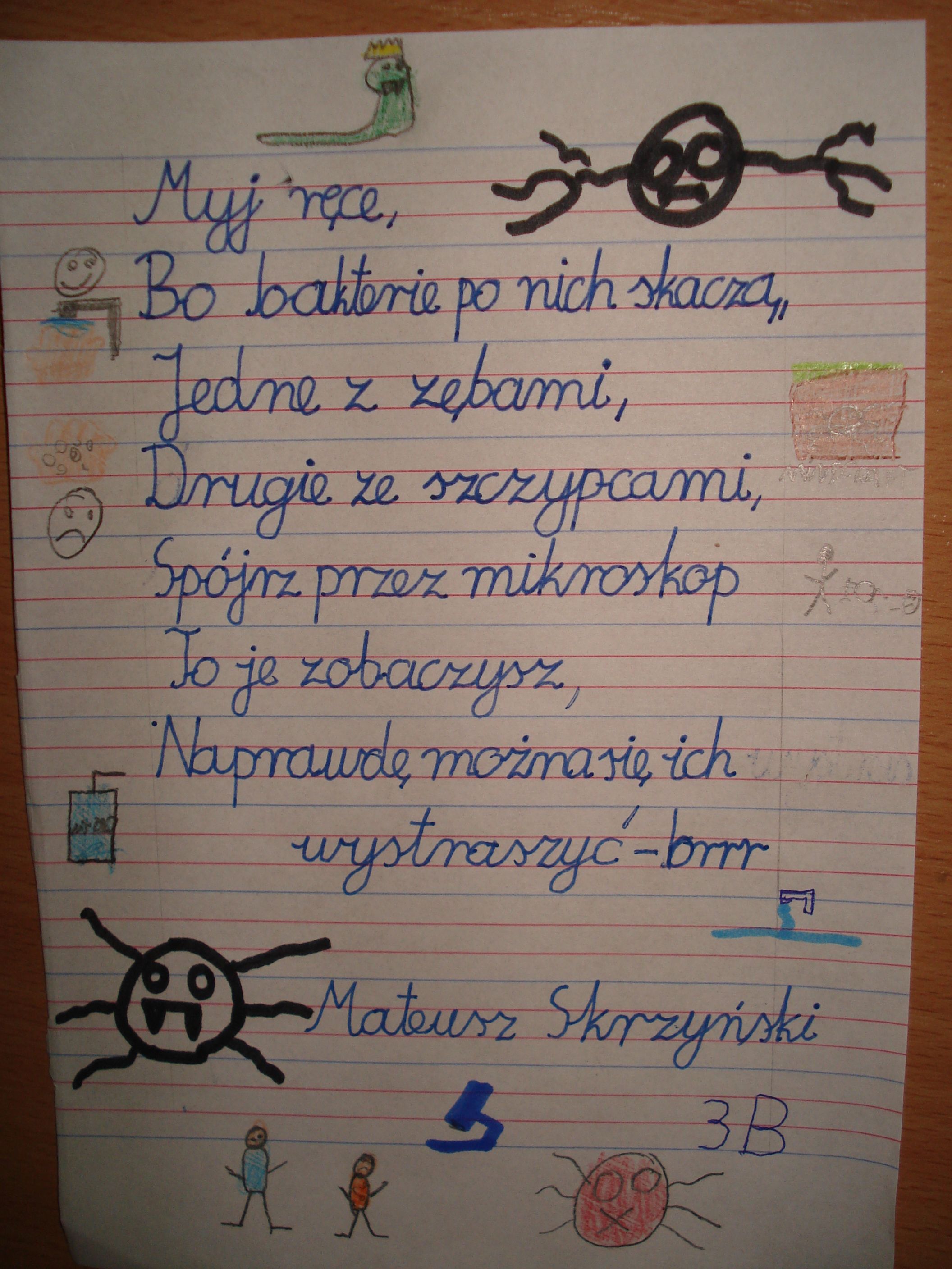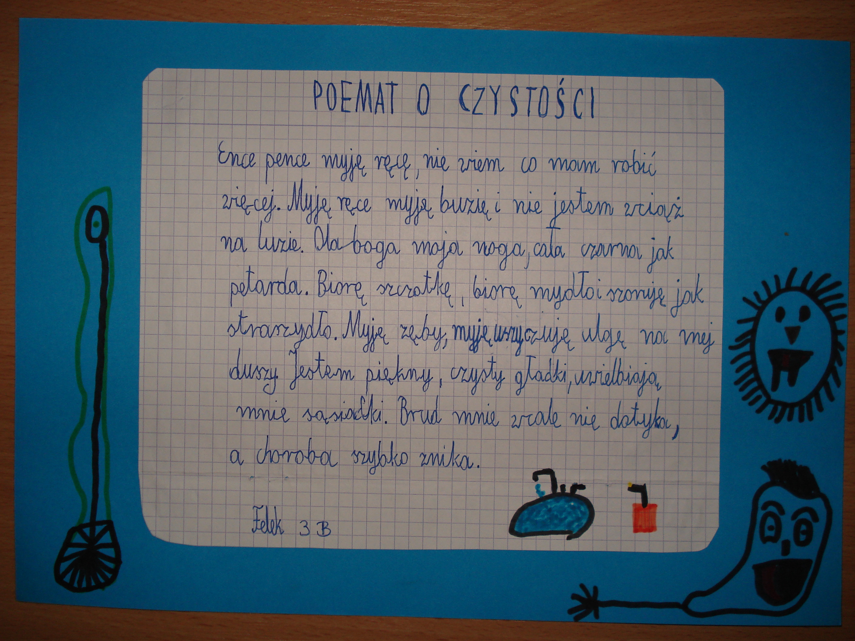 Klasa 3b postanowiła w nieco żartobliwy sposób przypominać młodszym kolegom o konieczności systematycznego mycia rąk po wyjściu z toalety. Każdy napisał hasło-rymowankę i opatrzył ją rysunkiem. Rekordziści napisali po 4 wierszyki. Wszystkie prace zawisły na drzwiach szkolnej toalety. Już są widoczne pierwsze efekty – ilość zużywanego papierowego ręcznika uległa podwojeniu.