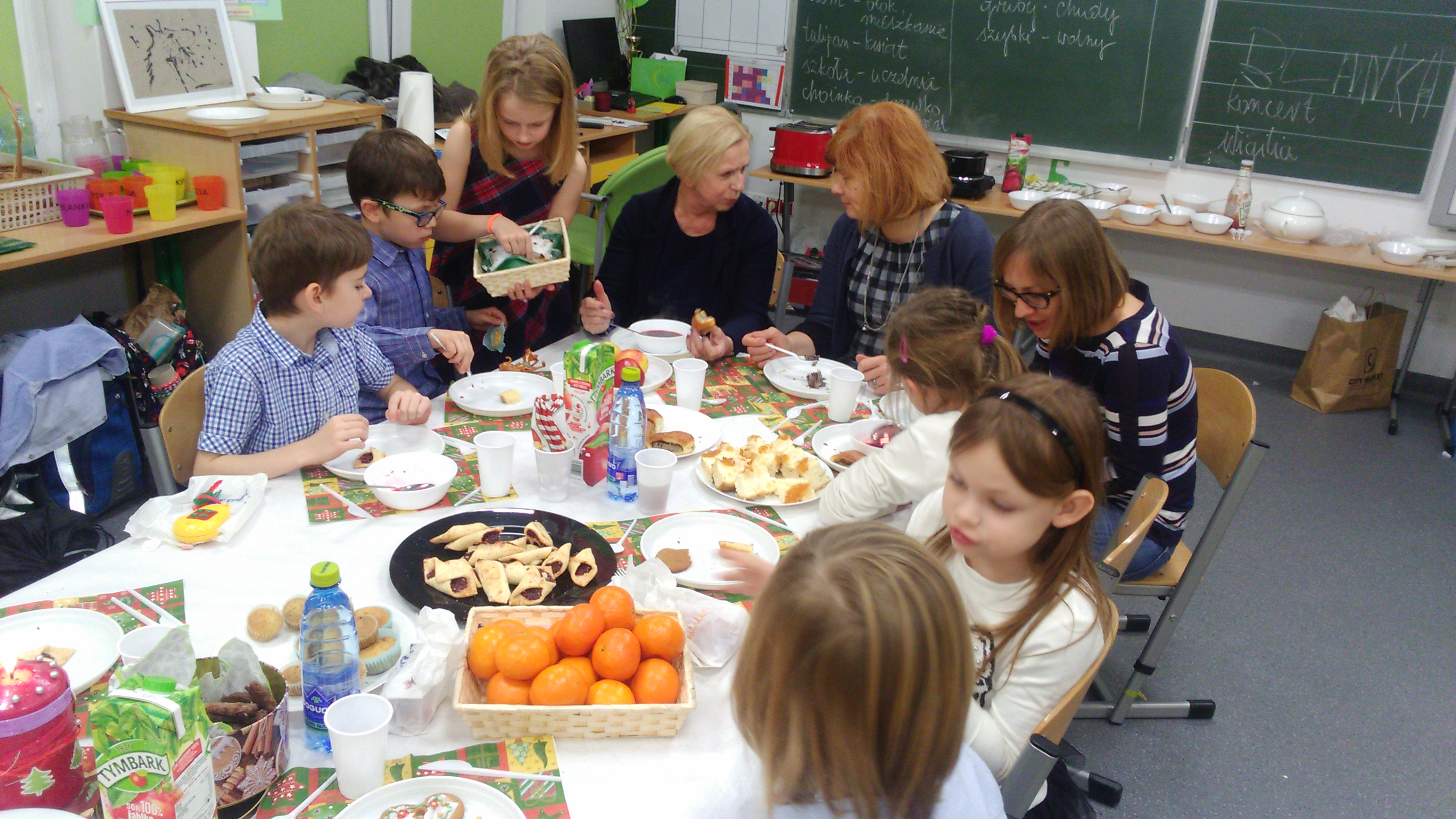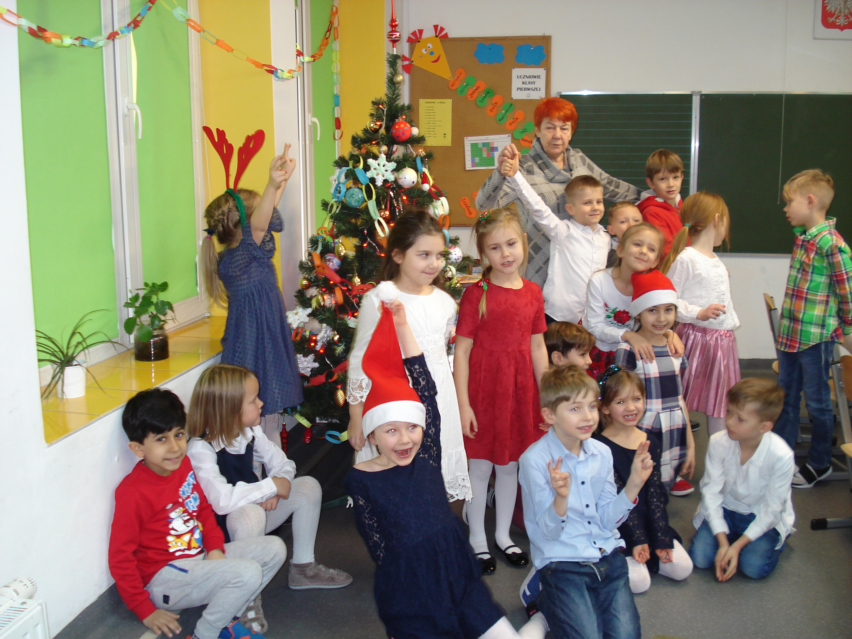 Klasa 1 obchodziła wspólną wigilię wokół pięknie przystrojonej choinki. Dzieci wraz z wychowawczynią same robiły część choinkowych zabawek. Uroczyście nakryty stół i wspaniałe łakocie radowały maluchy. Dzieci składały sobie życzenia i uczyły się elegancji obowiązującej przy stole.