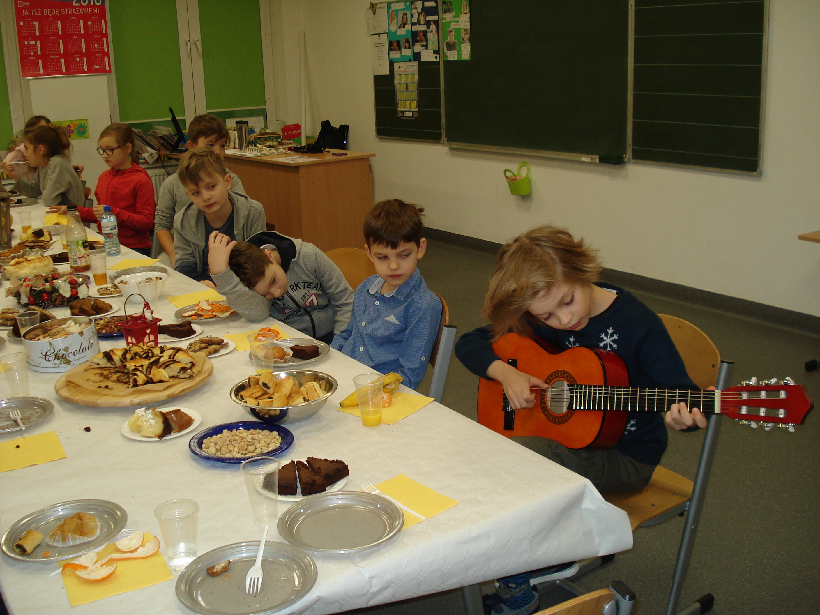 W 21 grudnia sala nr 7 zamieniła się w salon koncertowo - wigilijny. Dzień był szczegółowo zaplanowany i klasa 3a kolejno wypełniała jego punkty treścią. Dużo czasu dzieci poświęciły na przygotowania. Udekorowały stół wigilijny i postawiły na nim wszystkie nakrycia i potrawy. Gdy wszystko było gotowe rozpoczął się koncert. Najpierw dzieci śpiewały kolędy, potem grały na pianinie, na dzwonkach i fletach. Próbowały improwizować głosem, wymyślając melodie do wierszy świątecznych znalezionych w podręcznikach. Po koncercie były niespodziewane prezenty przygotowane przez Blankę. Potem wszyscy zasiedli wokół stołu i każdy składał życzenia świąteczne. Na poczęstunek dzieci zaprosiły Panie Dyrektor. Były obecne Pani Prezes Jolanta Węglowska, Pani Dyrektor Joanna Lejza i Pani Psycholog Dominika Nierzewską. Wigilijna wieczerza rozpoczęła się tradycyjnym czerwonym barszczem z pasztecikami. Były pierniczki, ciasta, owoce i wiele smakołyków. Dzieci obdarowały swoich rodziców kartką świąteczną wyszywaną haftem matematycznym. Dzieci włożyły dużo pracy i zaangażowania w przygotowanie tego dnia. Z pomocą rodziców oraz wychowawczyni stworzyły wspaniałą uroczystość, na której wszyscy wspólnie w miłej atmosferze spędzili czas.