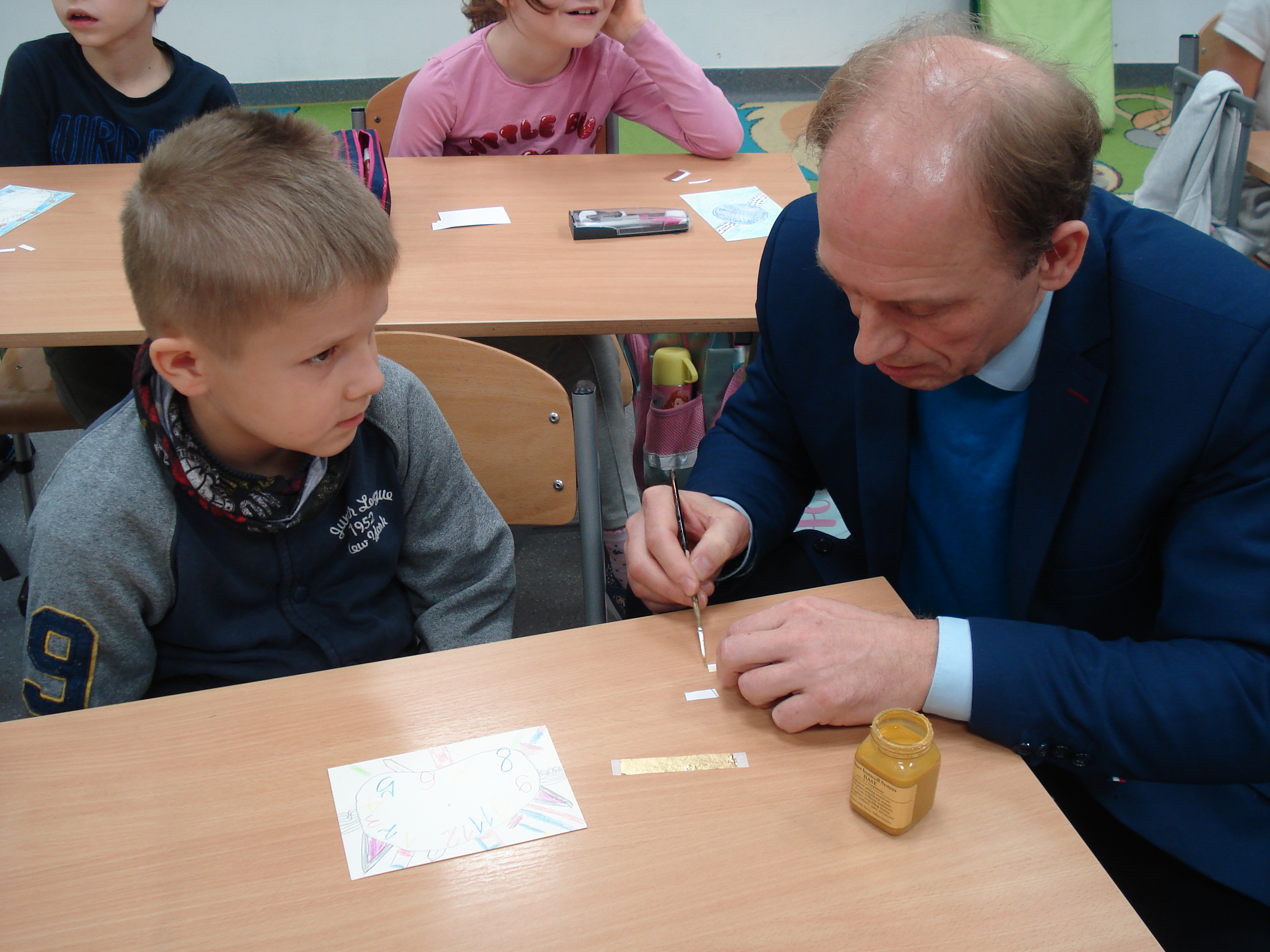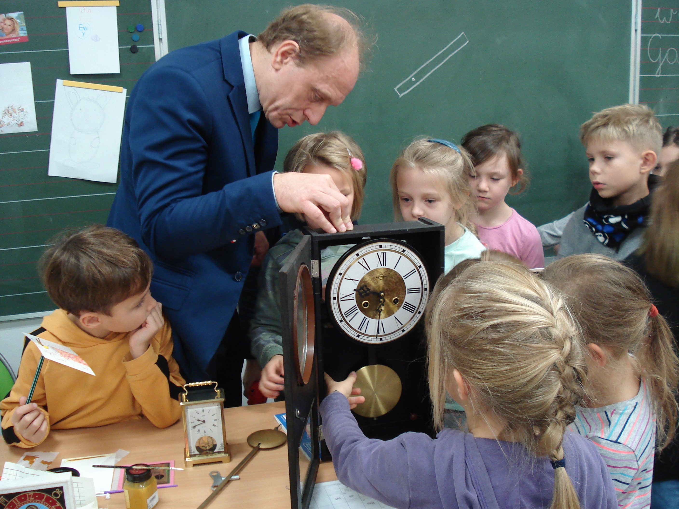 Znawca wszystkich tajemnic zegarów i czasu, a prywatnie tato jednej z uczennic klasy 2, przez dwie lekcje czarował dzieci czasem. Dzieci poznały historię czasomierzy, budowę zegara, miały okazję odmierzać czas wahadłem, które same zrobiły. Każdy otrzymał także maleńki werk zegarka. Dzieci usłyszały wiele ciekawostek na temat czasu i problemach z nim związanych. Na kolejnych zajęciach z Panem Dariuszem, dzieci samodzielnie pomalują najprawdziwszym złotem wskazówki wykonanych przez siebie na plastyce zegarów.