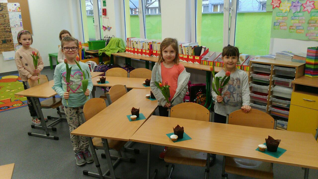 8 marca odbył się w klasie 1a uroczysty Dzień Kobiet. W tym dniu, aby podkreślić wyjątkowość wydarzeń, chłopcy z klasy wyręczali dziewczynki w różnych czynnościach, a pierwszą z nich było zanoszenie plecaków do klasy. Dziewczynki czekały na zaproszenie do klasy w świetlicy, a chłopcy z pomocą rodziców przygotowywali uroczystość w klasie. Gdy już wszystko było gotowe dziewczynki weszły do sali, gdzie przywitali ich chłopcy piosenką i życzeniami. Każda dziewczynka otrzymała kwiatek wykonany przez chłopców w domu i prezent notes - pamiętnik zamykany na kluczyk. Potem już wszyscy razem świętowali przy stole częstując się przysmakami.