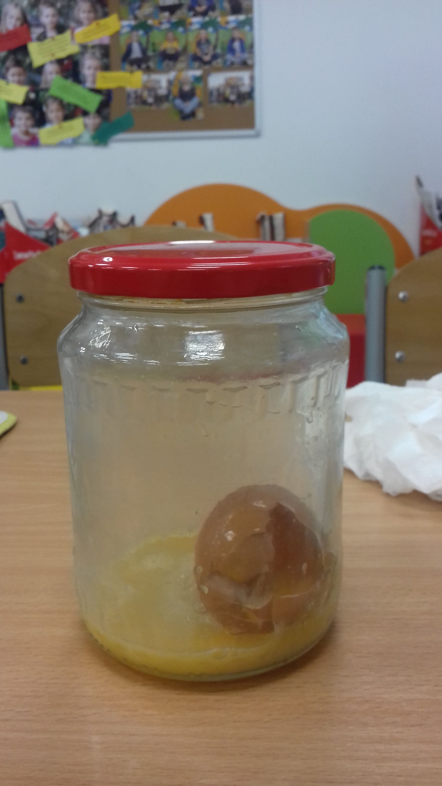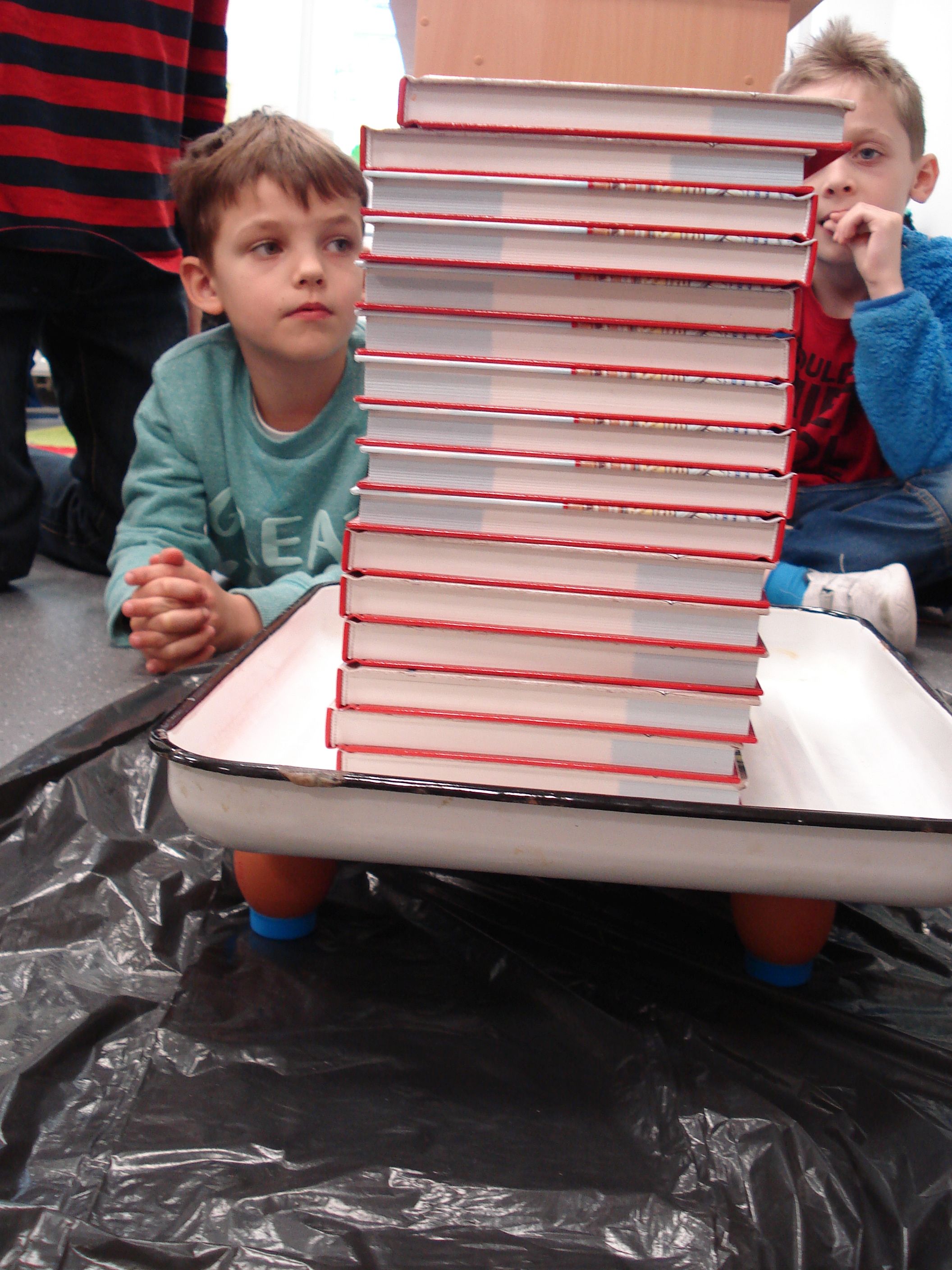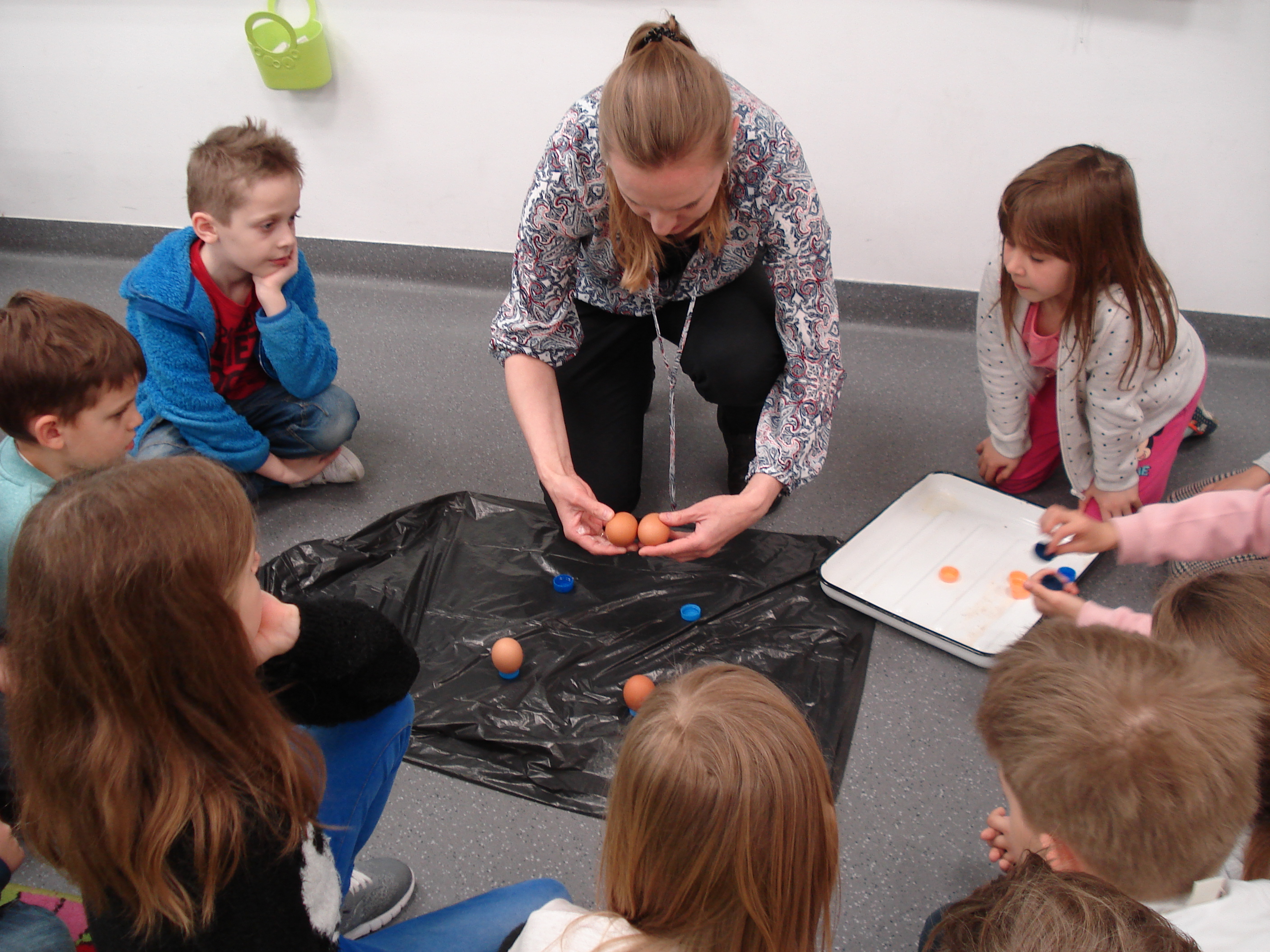 I tym razem uwielbiane przez dzieci z klasy 2b eksperymenty prowadzone przez biologa, P. Anię Bocian, były nad wyraz ciekawe. Dzieci badały, jaki ciężar może znieść surowe jajko kurze w skorupie. Dzieci wraz z nauczycielką na 4 jajkach układały coraz większy ciężar, równomiernie rozłożony. Pierwsze 10 książek ułożonych na jajkach nie budziło zdziwienia. Kolejne 10 było już okupione dużą niepewnością, co się wydarzy. Nic się jednak nie działo. Kiedy doszliśmy do 170 (!) książek, piramidka zaczęła się lekko chwiać. Wreszcie przy 173 książce, skorupki nie wytrzymały, coś chrupnęło i na podścieloną folię wylały się 4 jaja. Potem komisyjnie wybrano najlżejsze dziecko w klasie - Lenę. Pani Ania ostrożnie postawiła dziewczynkę na metalowej podkładce leżącej na 4 jajkach. Chwilę to trwało, ale ostatecznie skorupki nie wytrzymały, ciężar Leny je pokonał. Teraz już na pewno dzieci zapamiętają, jak bardzo wytrzymała jest skorupa jajka i dlaczego. Musi wszak znieść ciężar siedzącej na niej kwoki czy innego ptaka. Szczegóły doświadczenia wspaniale widać na zdjęciach...