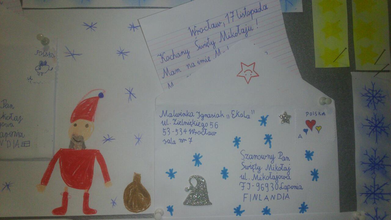 Dzieci z klasy 2a postanowiły w tym roku napisać list do Mikołaja. Nauczyły się przy tej okazji jak adresować kopertę, gdzie umieszczać znaczek oraz jaka jest struktura listu. W listach przekazały swoje najskrytsze marzenia związane z prezentem od Mikołaja.