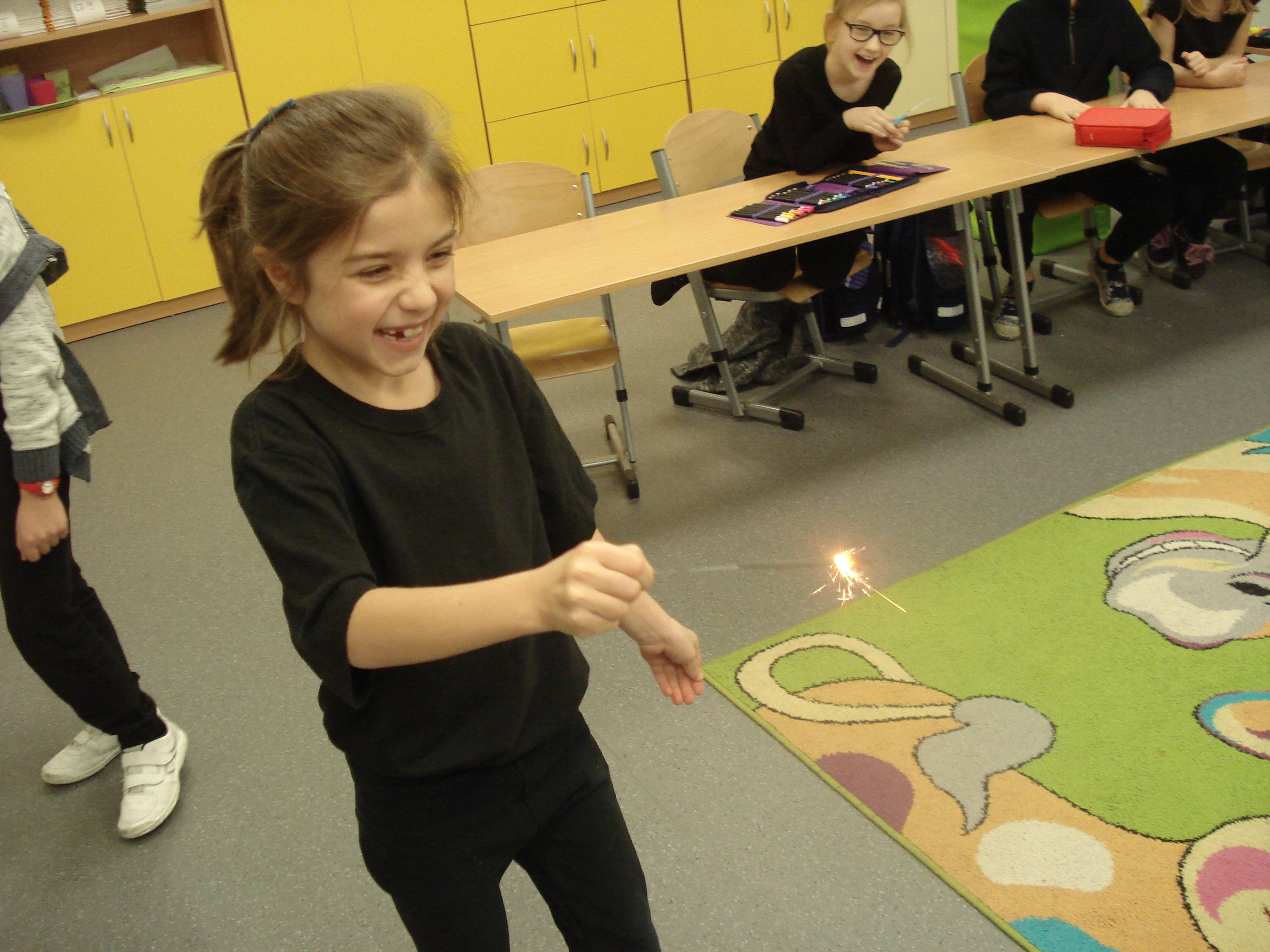 Klasa 2b symbolicznie pożegnała kończący się rok 2016. Każde dziecko zapaliło sztuczny ogień i, kreśląc tajemne znaki w powietrzu, żegnało stary rok. Niektórzy po raz pierwszy mieli w ręku sztuczne ognie! Zabawa była świetna, ale i kawałek zadumy nad upływem czasu też jej towarzyszył.