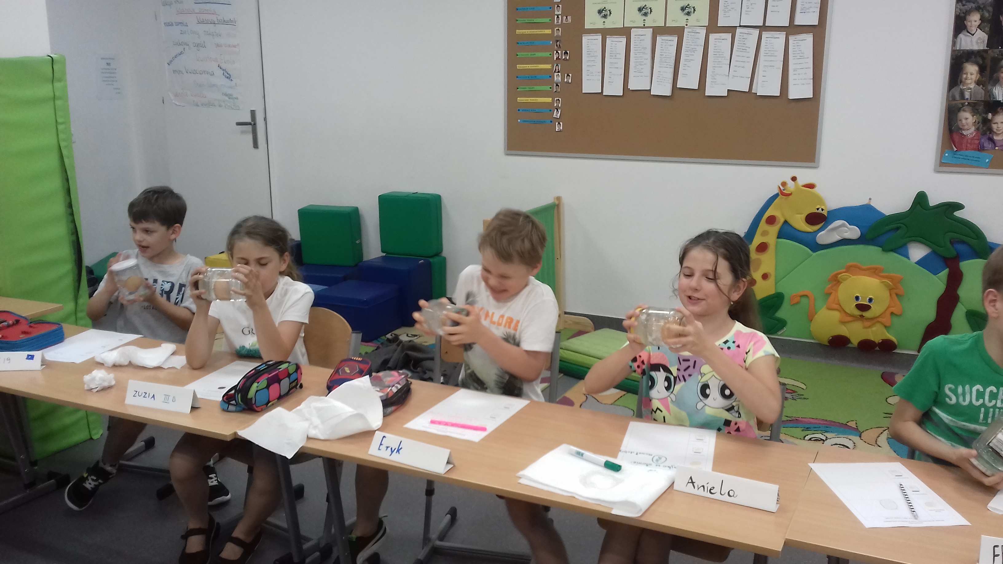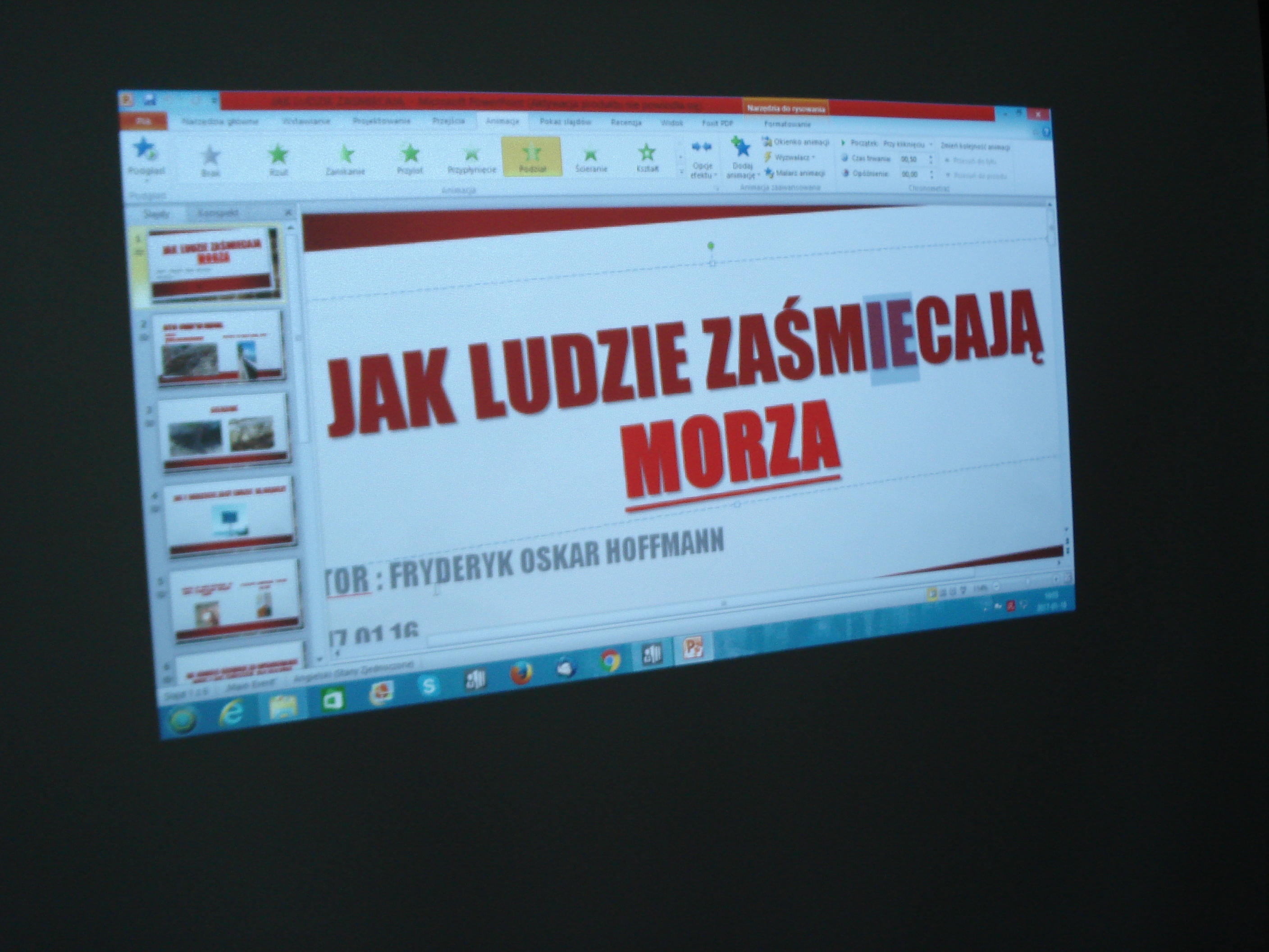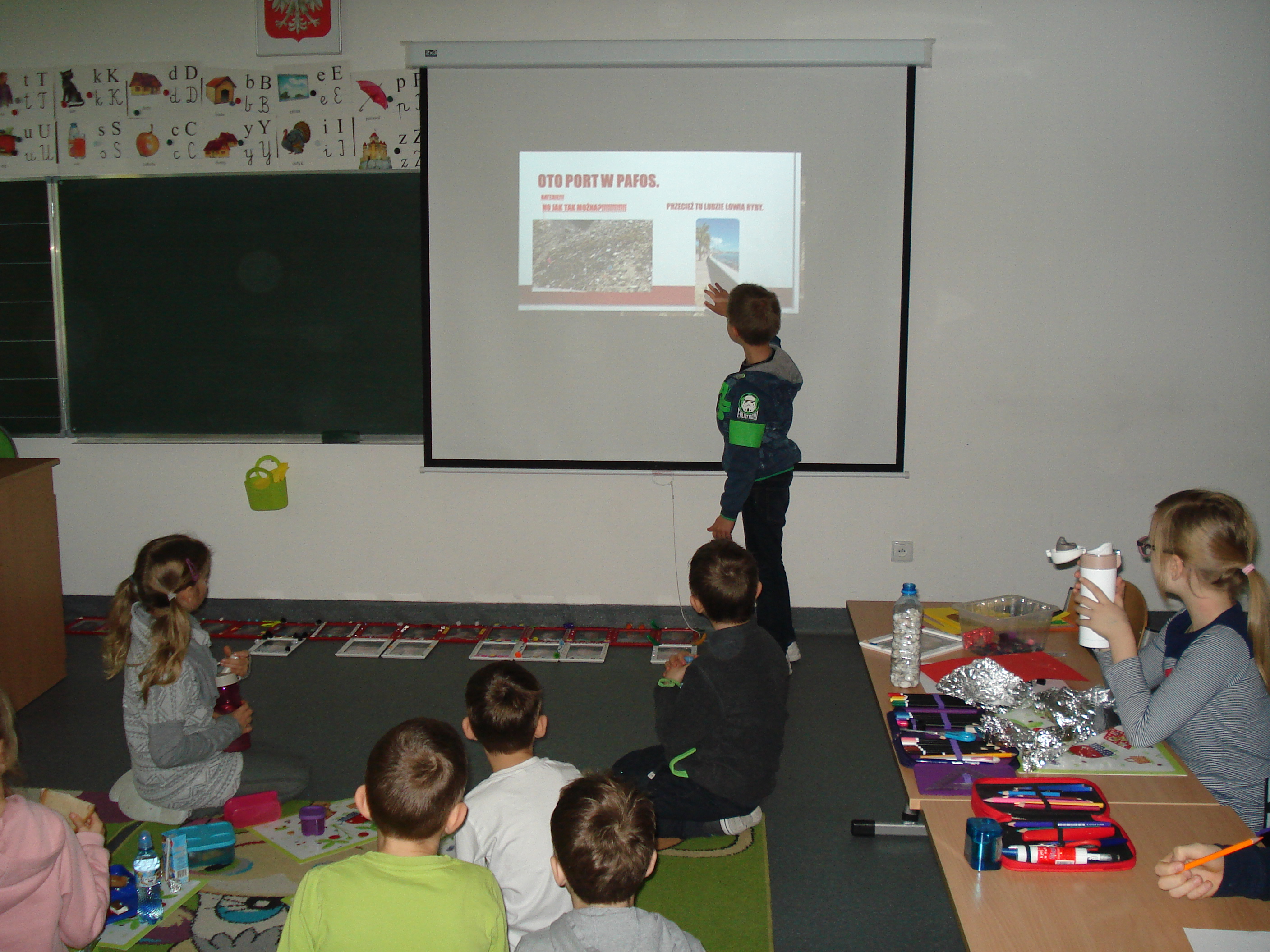 Zagadnienia ekologii nie są obojętne klasie 2b. Kiedy uczeń tej klasy, Fryderyk Oskar Hoffmann, zauważył w trakcie wycieczki z rodzicami, jak bardzo są zanieczyszczone plaże, lasy i rzeki, samorzutnie przygotował prezentację na temat śmieci. W bardzo profesjonalny sposób, ze słownym komentarzem, zaprezentował ją kolegom z klasy. Zainteresowane dzieci prosiły nawet o powtórkę prezentacji. Czyżby była szansa na to, że kolejne pokolenie będzie jeszcze miało czym oddychać...?