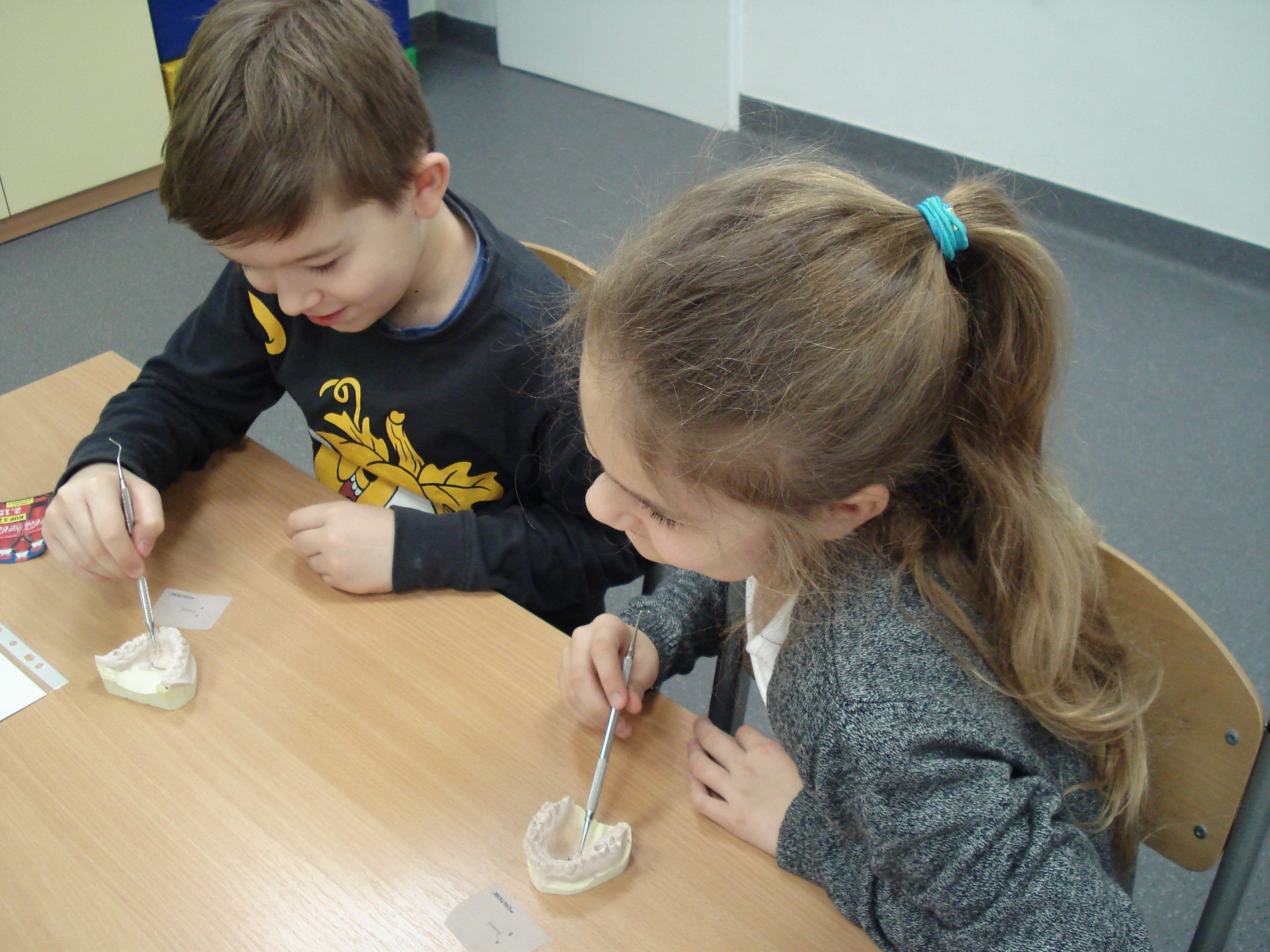 Klasa 2b gościła na zajęciach mamę jednego z uczniów. Pani Agnieszka jest stomatologiem. Było to już drugie jej spotkanie z dziećmi. Maluchy dowiedziały się, ile mają zębów one, a ile dorośli oraz jak się nazywają poszczególne zęby. Potem każdy dostał "pacjenta" w postaci gipsowej szczęki z ubytkami oraz prawdziwe, różnokolorowe plomby i narzędzia stomatologiczne. Dzieci plombowały zęby swoich "pacjentów". Ochotnicy demonstrowali prawidłowy sposób mycia zębów. Nie zabrakło także różnych gadżetów w postaci gumek w kształcie zęba, past zapachowych do zębów, nalepek i krzyżówek. Teraz już nikt nie boi się wizyty u stomatologa.