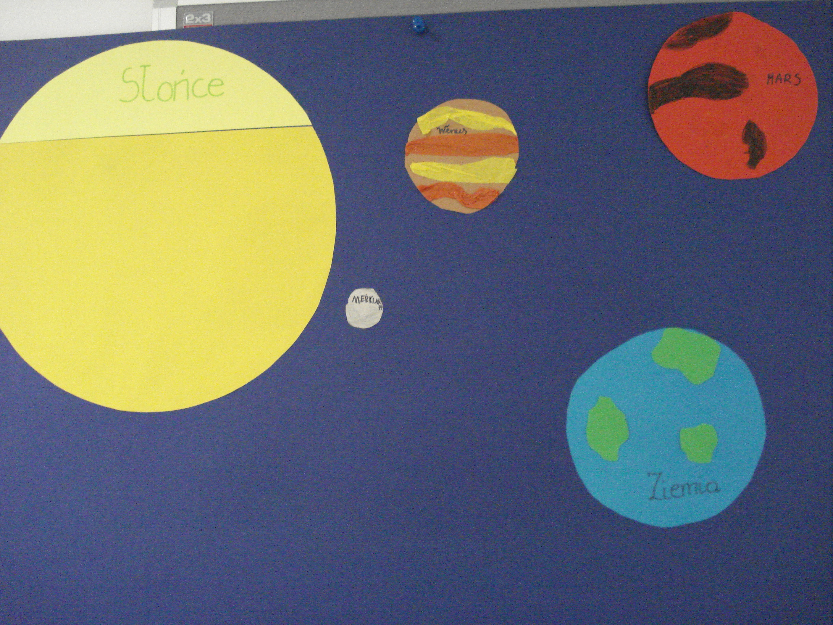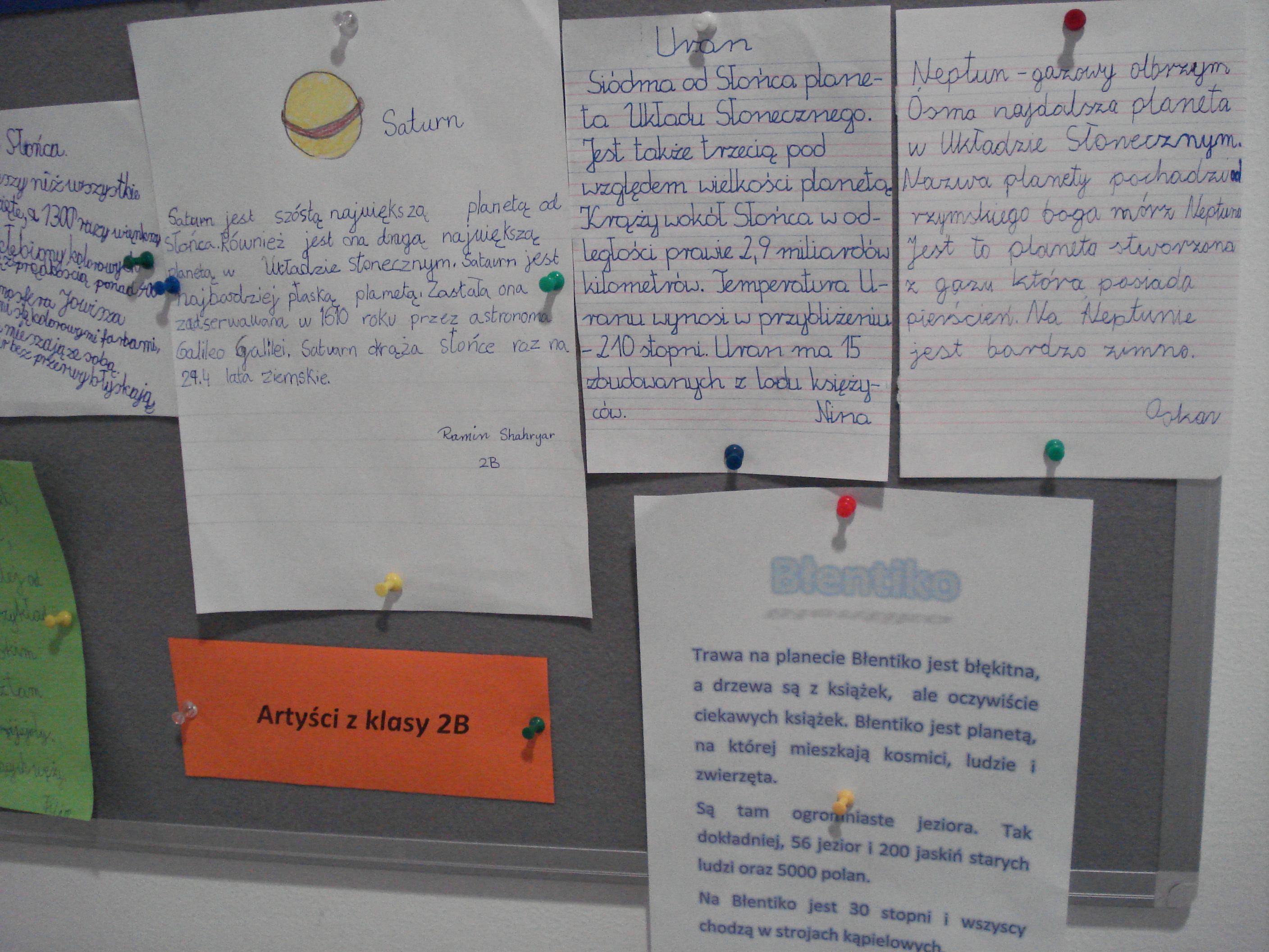 Klasa 2b poznawała Układ Słoneczny w nieco nietypowy sposób. Każdy miał przygotować w domu ciekawy opis wybranej przez siebie planety, korzystając z dowolnych źródeł wiedzy. W ruch poszły encyklopedie, internet i ... głowy rodziców. Dla kogo zabrakło planety, wymyślał ją sobie korzystając z ... wyobraźni. Następnego dnia dzieci powycinały swoje planety z kolorowego papieru. Na efekt popatrzcie sami...
