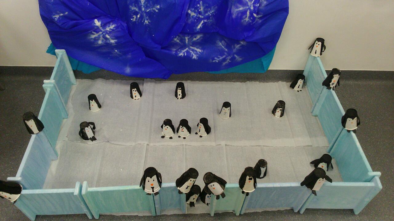 Kalendarzowa zima w pełni, za oknem śniegu jednak nie ma. W klasie 2a jesienne drzewo zrzuciło liście i pojawiły się śnieżne gwiazdki, a nawet jakiś elf przysiadł na chwilę. Dzieci zbudowały lodową zagrodę, w której chętnie zamieszkały pingwiny. Pingwiny zostały zrobione z kubeczków po napojach, mogą więc śmiało nazywać się Ekopingwinami. W naszej ekologicznej szkole stale uczymy się jak segregować i wykorzystywać odpady. Lodowa kraina powstała podczas omawiania lektury "Zaczarowana zagroda". W naszej klasie panuje więc zimowy klimat rodem z Antarktydy. Ale nie brakuje też ciepłych akcentów. Rozświetlona choinka zachęciła dzieci do przygotowania świątecznych upominków dla swoich rodziców. Gąbkowe (też ekologiczne) choinki wraz z własnoręcznie wykonanymi kartami pełnymi pięknych życzeń dzieci wręczyły rodzicom po świątecznym koncercie. Zima wokół, ale serca zawsze gorące. Życzymy dużo szczęścia w Nowym Roku!
