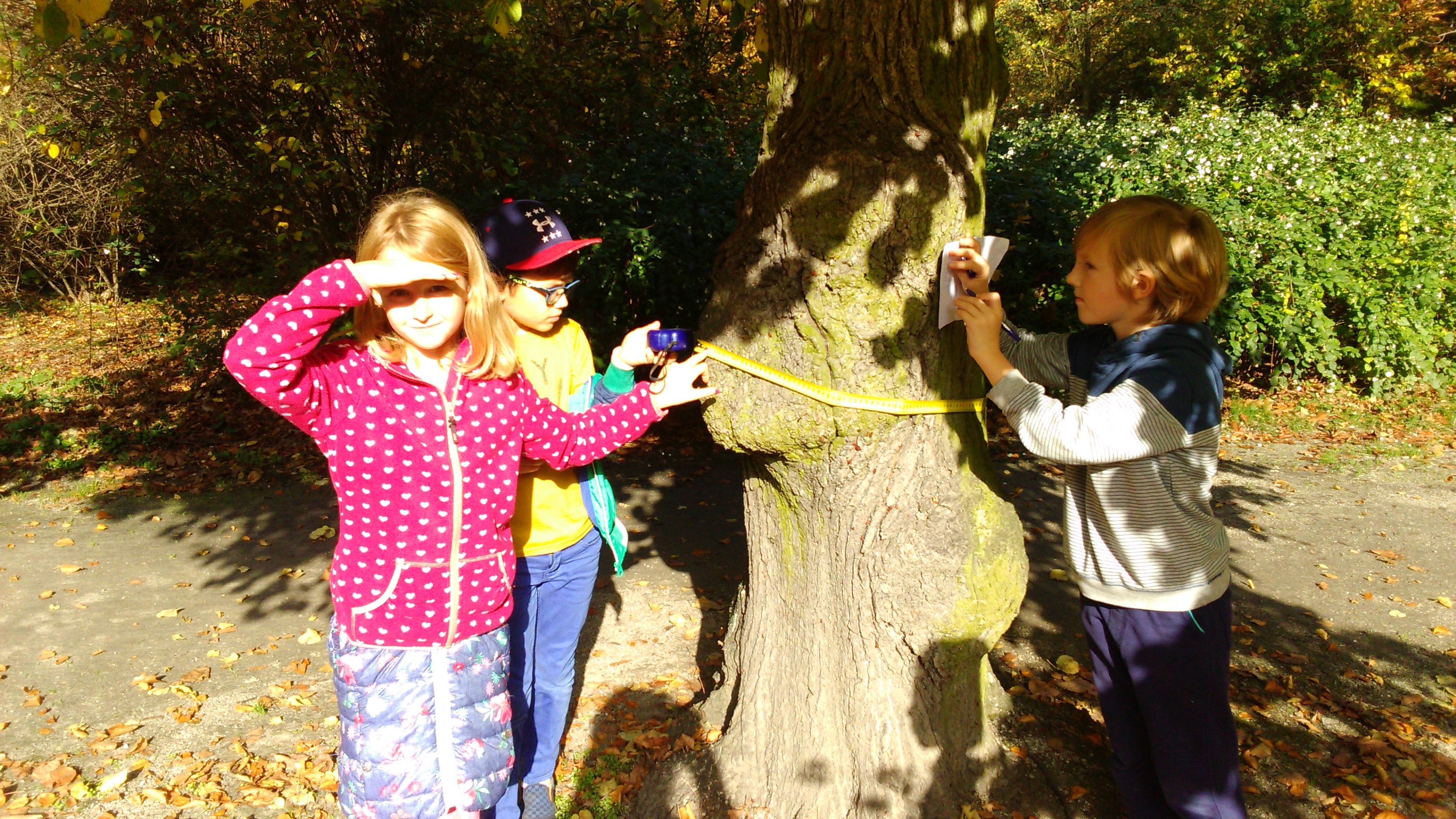 Październik obdarował wszystkich piękną, słoneczną pogodą. W tym czasie wiele zajęć edukacyjnych mogło odbywać się w plenerze. Klasa 3a, wyposażona w miarki i urządzenia liczące, spotkała się w parku. Dzieci mierzyły obwody drzew i obliczały prawdopodobny wiek każdego zmierzonego drzewa. Ustalały również nazwę drzewa, oglądały jakie ma liście i ewentualne owoce. Zadanie wykonywały pracując w parach. Wcześniej założyły koszulki z logo EKOLI, wskazując tym samym, że bycie małym ekologiem i uczniem EKOLI to wspaniała przygoda ich życia.