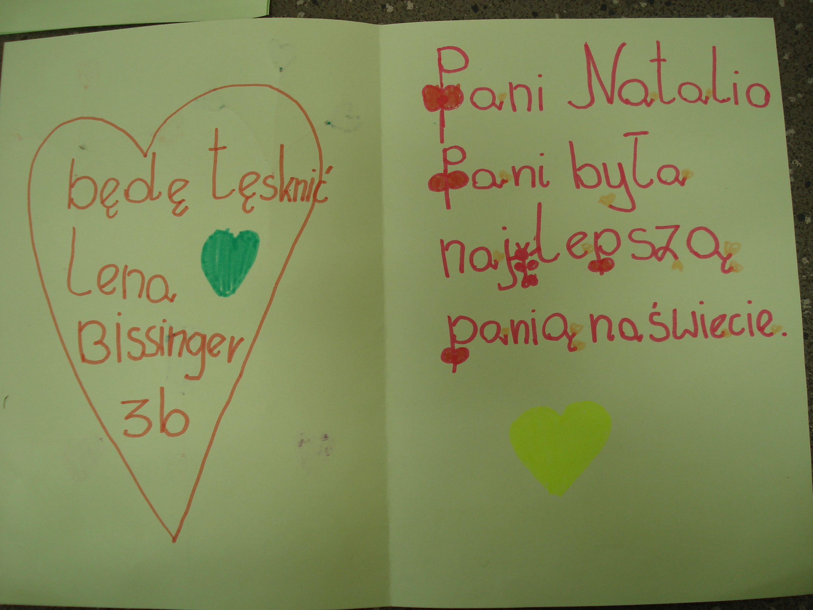 Jest czas powitań i czas pożegnań. Pani Linde z „Ani z Zielonego Wzgórza” twierdziła nawet, że „całe nasze życie składa się z powitań i pożegnań”. Klasa 3b z wielkim żalem pożegnała odchodzącą ze szkoły panią Natalkę pracującą w świetlicy szkolnej. Prócz wielkiego kosza łakoci, Pani Natalka otrzymała także lawinę laurek z podziękowaniami za humor, cierpliwość i pracę oraz tysiące całusków. Tak dziękować potrafią tylko dzieci…