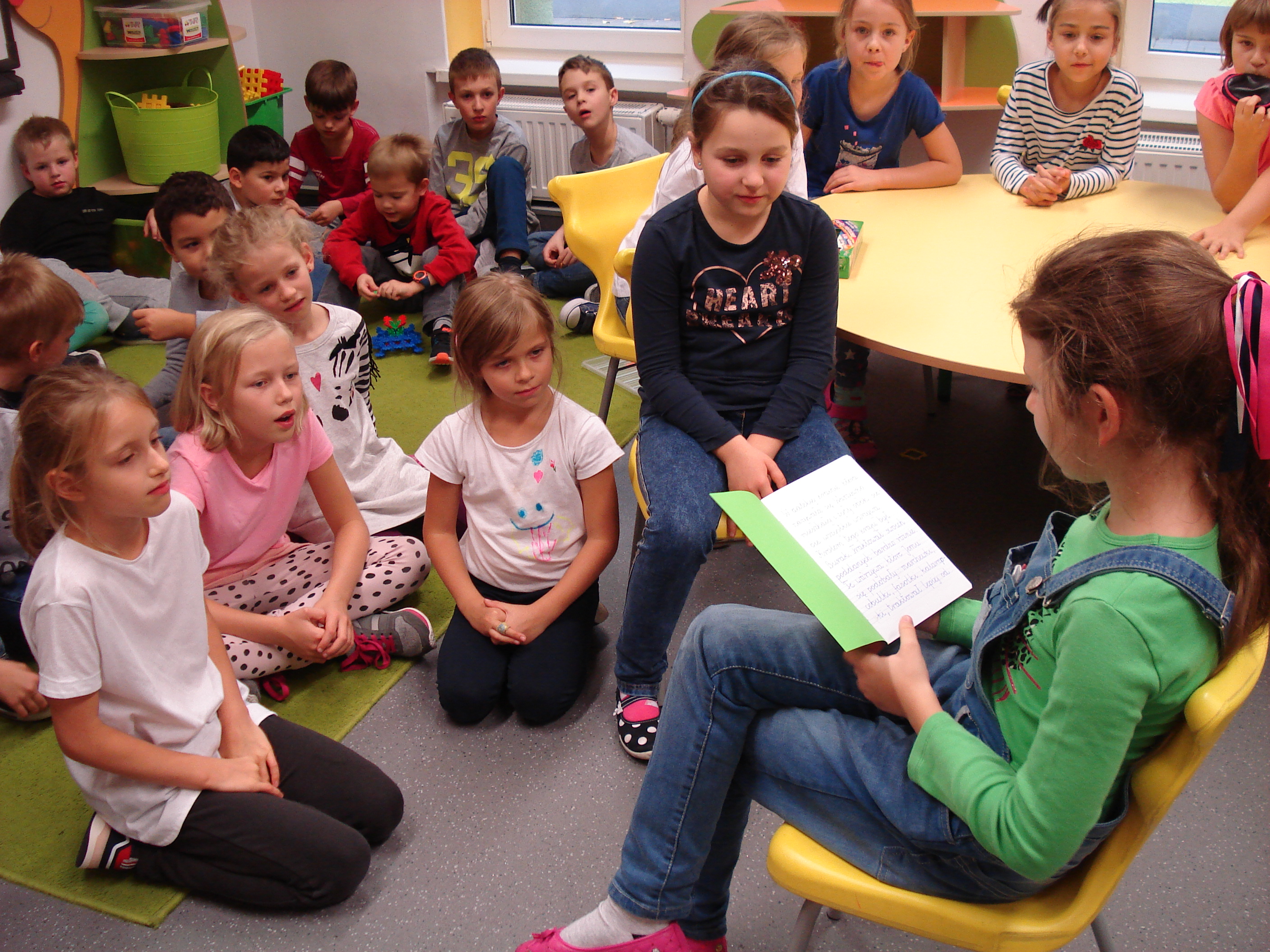 Dzieci z klasy 3b nie tylko napisały ziemniaczane bajki na spotkanie kulturalno-kulinarne KARTOFLISKO, ale także postanowiły zaprezentować bajki swoim młodszym kolegom ze szkoły. W czasie rekreacji, po kolei zapraszały klasy 1 i 2 i czytały na głos własnoręcznie napisane bajki. Maluchy słuchały z wielkim zaciekawieniem. Kolorowe rysunki w książeczkach dopełniły dzieła.