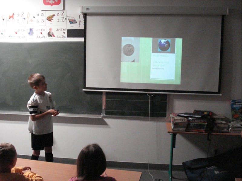 Dzieci z klasy 2 sukcesywnie prezentują kolegom swoje hobby. Tym razem Maciek przygotował prezentację i opowiadał o piłce nożnej i podróżach.