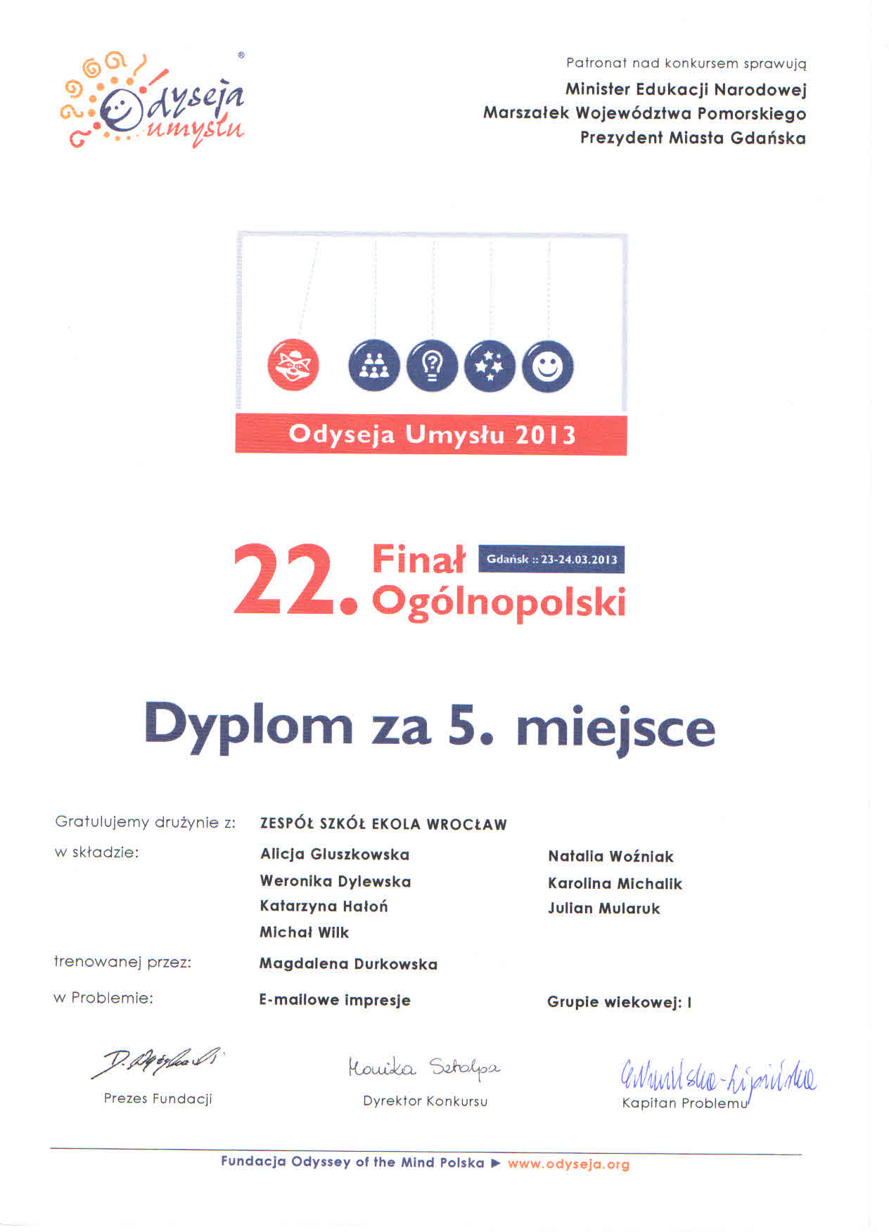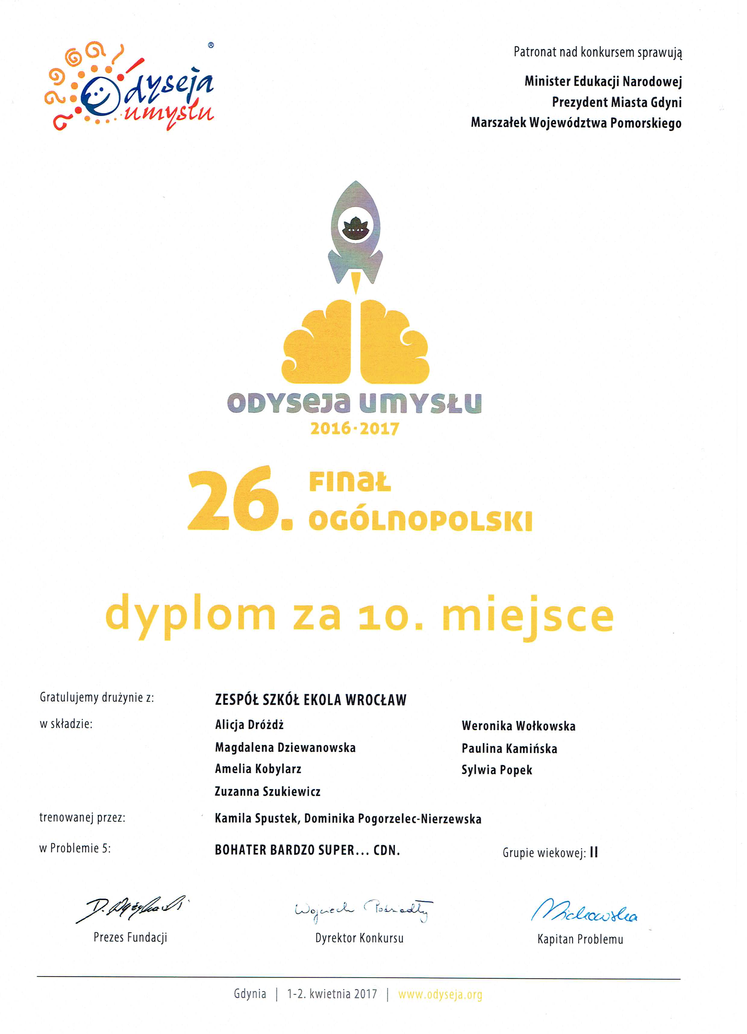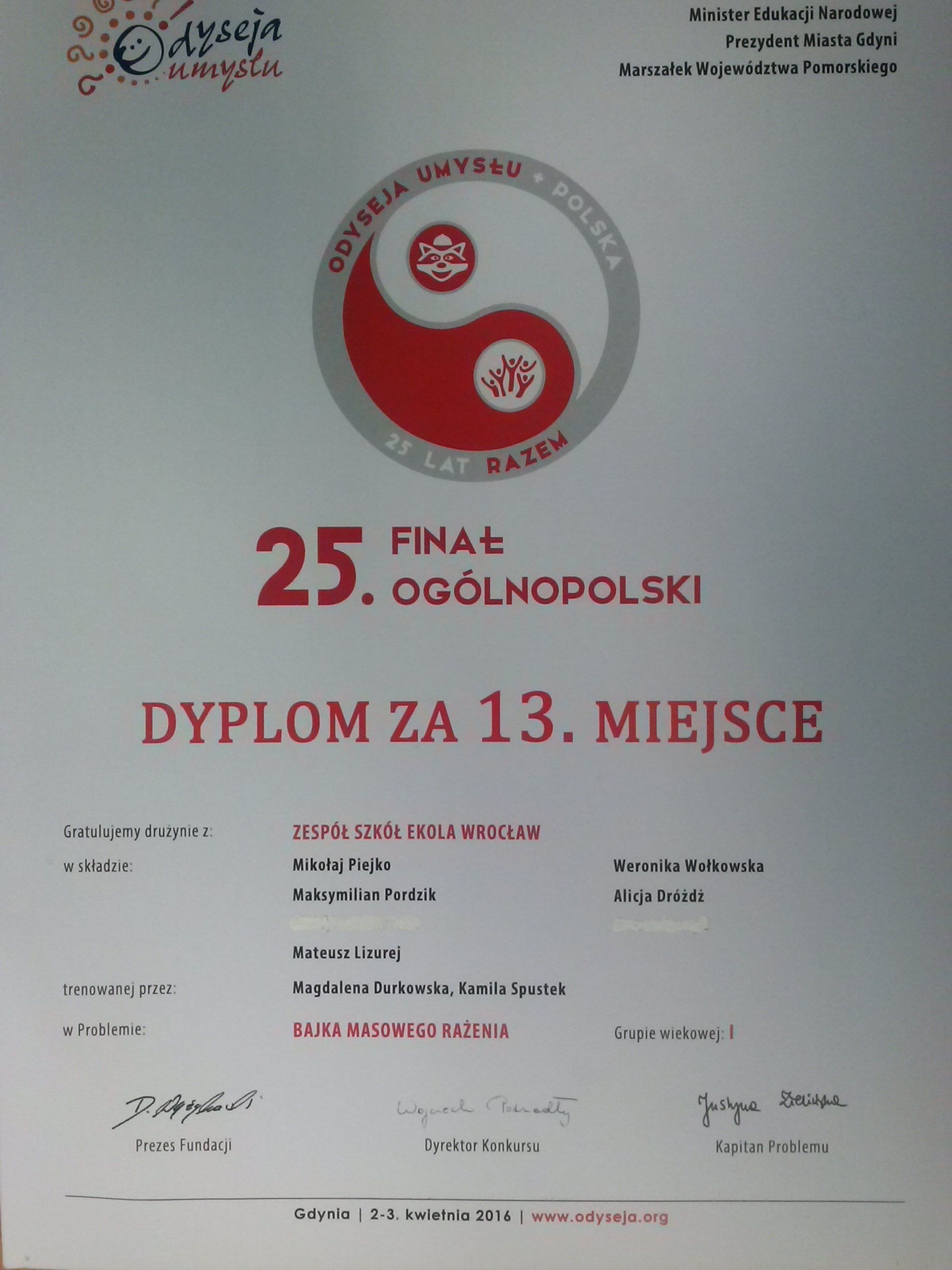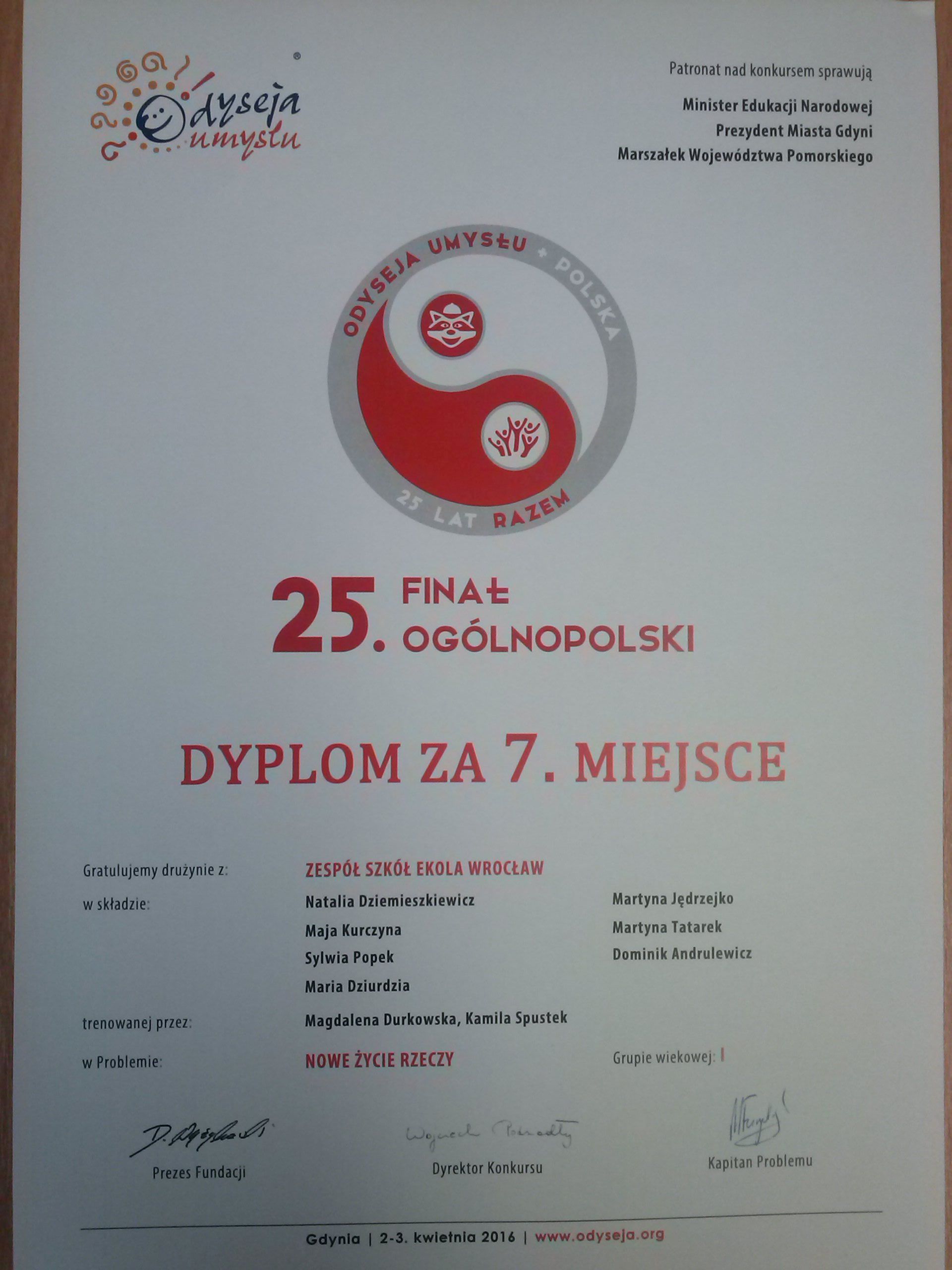 - kwiecień 2017 - udział drużyny z EKOLI w Ogólnopolskim Finale Odysei Umysłu - nasz dyplom: