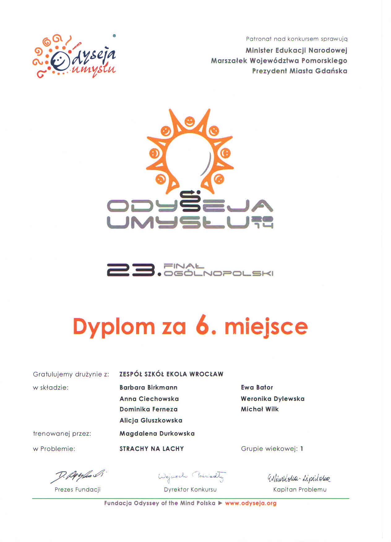 - kwiecień 2016 - udział dwóch drużyn z EKOLI w Ogólnopolskim Finale Odysei Umysłu - relacja, zdjęcia i nasze dyplomy: