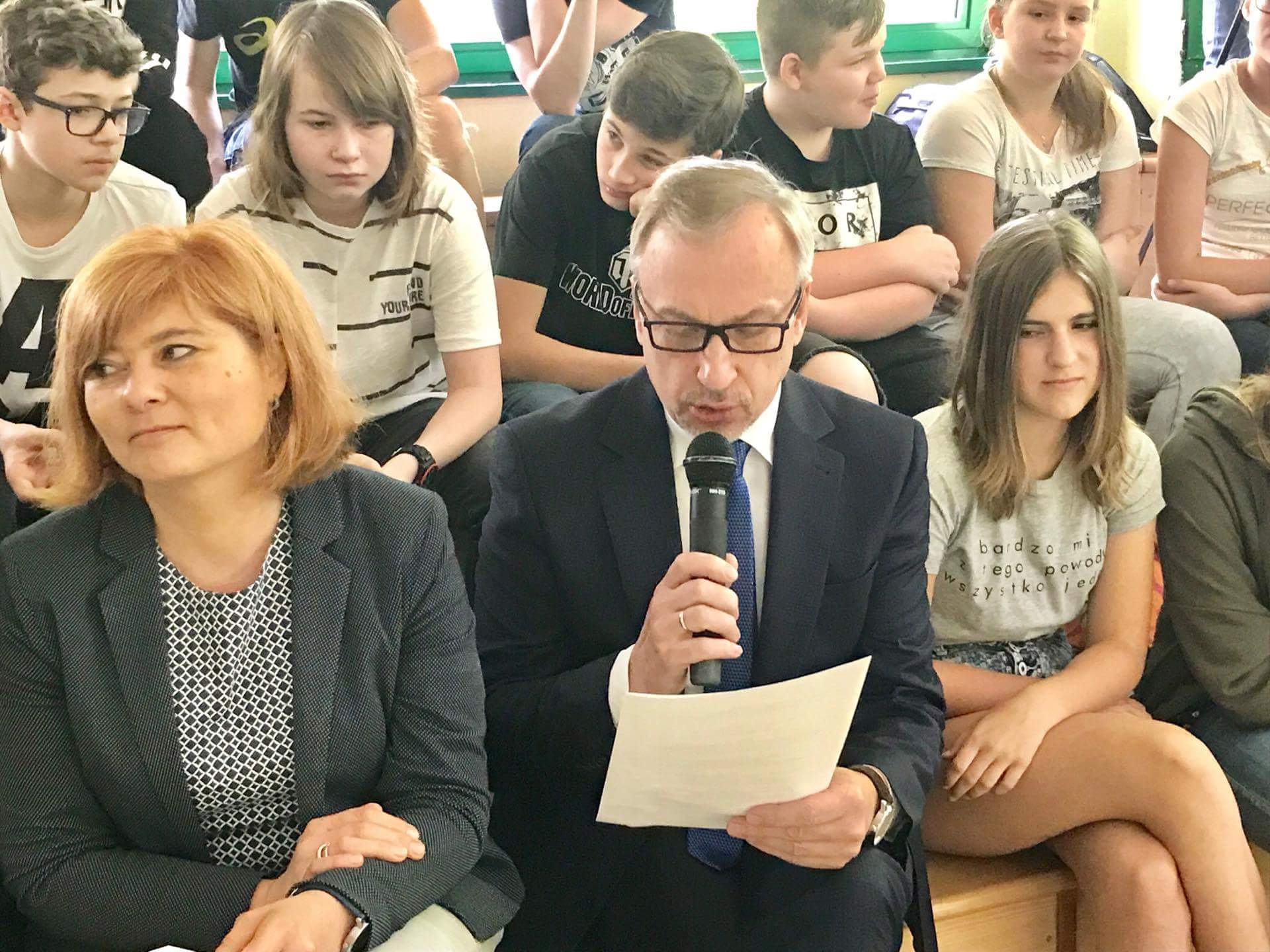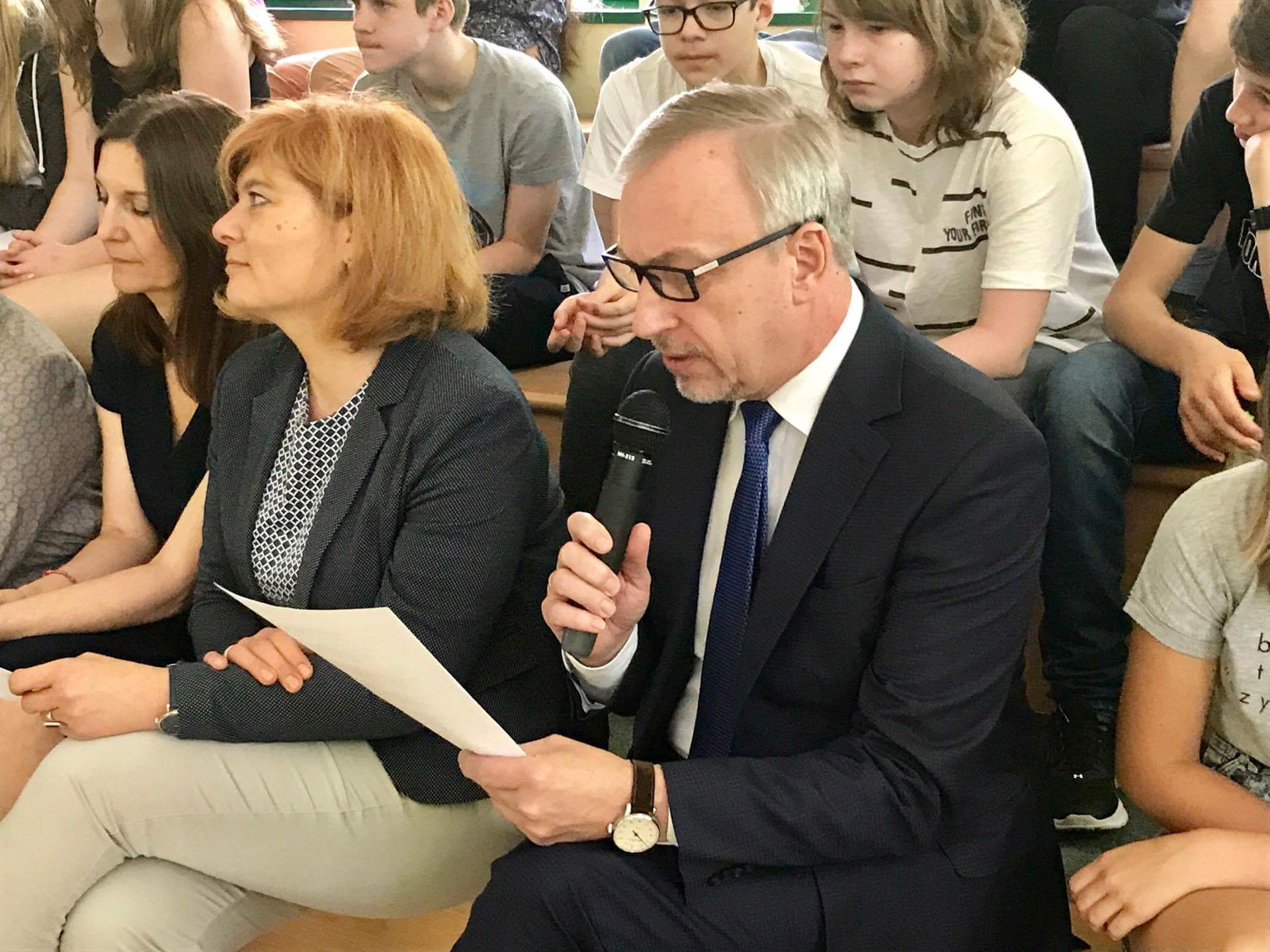 We wtorek, 6 czerwca, uczniowie Gimnazjum EKOLA spotkali się z p. senatorem Jarosławem Obremskim (zastępcą przewodniczącego senackiej Komisji Spraw Zagranicznych i Unii Europejskiej). Spotkanie poświęcone było pobytowi p. Obremskiego w obozie dla uchodzców w Pozzallo na Sycylii i nawiązywało do naszej wcześniejszej dyskusji o „Tym Innym”. Pan senator opowiedział o tym, co zobaczył i czego dowiedział się w Pozzallo, podzielił się z nami refleksjami na temat Wrocławia, Polski, Polski w Europie oraz przyszłości Unii Europejskiej, a uczniowie przypomnieli swoje referaty wygłoszone podczas spotkania z „Tym Innym” (Karolina Żurek, Stanisław Wróbel, Chris Bauer). Spotkanie z J. Obremskim było kolejnym, podczas którego uczniowie EKOLI mieli możliwość spotkać się z politykami, samorządowcami czy wrocławianinami (wcześniej gościliśmy m.in. Annę Szarycz, Rafała Dutkiewicza, Stanisława Huskowskiego, Jana Lityńskiego, Zbigniewa Maćkowa). Do najciekawszych spotkań w EKOLI uczniowie zaliczają rozmowy z p. Władysławem Frasyniukiem (XII 2015) oraz z p. Bogdanem Zdrojewskim (VI 2017). Pamiętam, że spotkania z p. Frasuniukiem i p. Zdrojewskim kończyliśmy wierszem, napisanym w obozie w Dachau w 1942 r. przez niemieckiego pastora luterańskiego Martina Niemöllera: