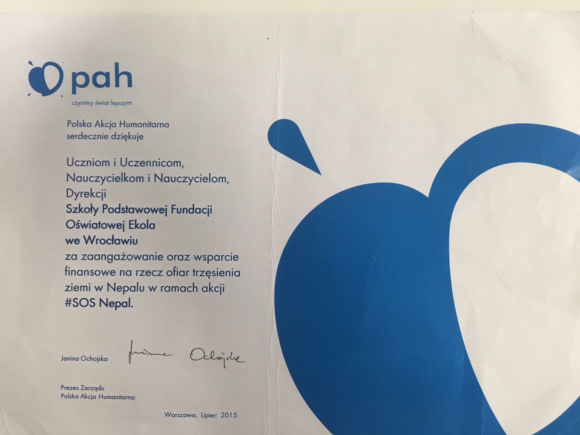"Zamiast kwiatka" - pod koniec roku szkolnego uczniowie EKOLI zdecydowali, że zamiast kupować kwiaty na zakończenie roku szkolnego, zorganizują zbiórkę pieniędzy w ramach akcji #SOS Nepal. Zebraną kwotę przekazali Polskiej Akcji Humanitarnej.